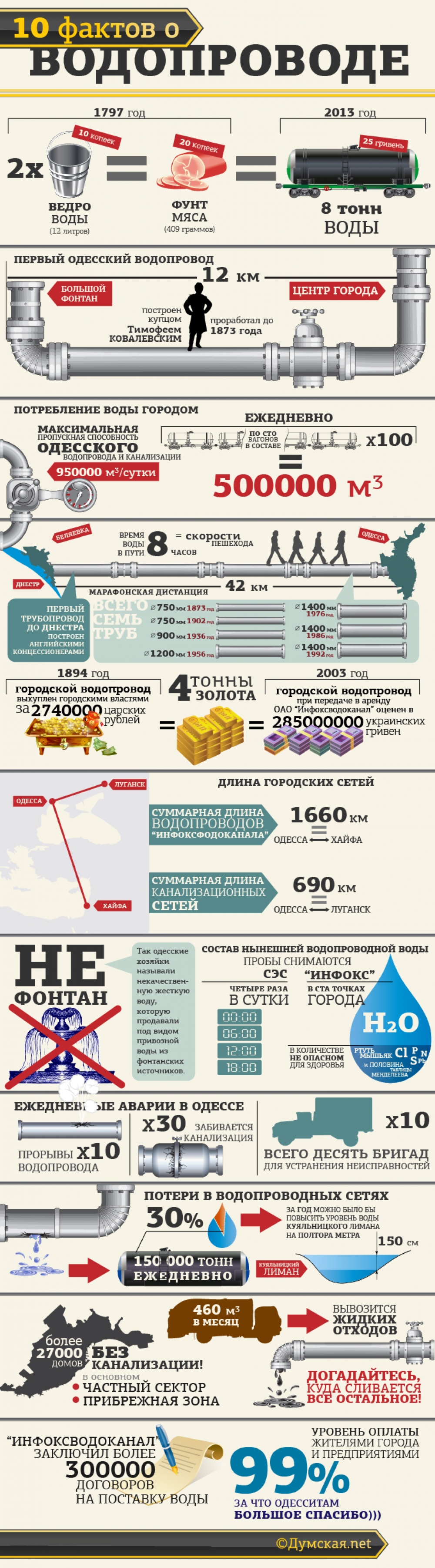 10 фактов о... Одесский водопровод стоит как 4 тонны золота и может дотянуться до Хайфы (инфографика)С водой в Одессе почти всегда была напряженка. В первые десятилетия существования города горожане собирали дождевую воду, а биндюжники возили бочки с Большого, Малого и Среднего Фонтана и продавали на Привозе на розлив. Первый водопровод появился в нашем городе свыше 160 лет назад, когда купец Ковалевский провел трубу от знаменитых артезианских источников на Большом Фонтане до центра города. В 1873 году английские специалисты построили водовод от Днестра. К столетию города, в 1894 году, городские власти выкупили днестровский водовод с уличными сетями, и он стал муниципальным предприятием. В 2003 году «Одессводоканал» был передан в аренду частной фирме «Инфокс». Городской водопровод стал частью одесской легенды. Ему ставили памятники, о нем слагали анекдоты и снимали кинофильмы. «Думская» собрала 10 интересных фактов об одесском водопроводе и сегодня представляет их читателям в своей новой рубрике, которая так и называется «Десять фактов о » 1. В 1797 году ведро воды стоило 10-15 копеек, а фунт мяса — 20 копеек. Сейчас фунт мяса (409 граммов) стоит столько же, сколько восемь тонн водопроводной воды. 2. Первый одесский водопровод построил купец Тимофей Ковалевский. Он проходил от источников на Большом Фонтане («Дача Ковалевского») до центра города. После банкротства и смерти хозяина он перешел в собственность города и проработал до 1873 года. 3. Сейчас город потребляет порядка 500 тысяч кубометров воды ежедневно. Чтобы перевезти такое количество воды по железной дороге, потребовалось бы сто составов по сто вагонов в каждом. А максимальная производительность водопровода и канализации — 950 тысяч кубометров. 4. Днестровская вода идет в Одессу со скоростью пешехода и проходит марафонскую дистанцию (42 километра) за 8 часов по семи трубопроводам разного возраста и разного диаметра: чем моложе, тем шире. В 1894 году первый Днестровский водовод (диаметром 750 мм) и уличные сети выкупили у английских концессионеров за 2.740.000 царских рублей, что примерно составляет 4 тонны золота. С тех пор построили еще шесть трубопроводов от Днестра до Одессы, и существенно расширили уличные сети. В 2003 году, при передача в аренду «Инфоксу», водопровод оценили в 285 миллионов гривен, что тоже составляет примерно 4 тонны золота по курсу НБУ. 5. Суммарная длина водопроводов «Инфоксводоканала» составляет 1660 км, что соответствует расстоянию от Одессы то Хайфы. Канализационные сети короче — 690 километров, если вытянуть их в одну линию, то получится труба из Одессы в Луганск. 6. Крылатая фраза «Не Фонтан!» родилась в нашем городе. Так одесские хозяйки называли некачественную жесткую воду, которую продавали под видом привозной воды из фонтанских источников. Сейчас в одесской водопроводной воде есть и ртуть, и мышьяк, и десятки других веществ и соединений, но в количестве, не опасном для здоровья. Так, на каждый атом свинца приходится несколько миллиардов молекул воды. СЭС контролирует качество водопроводной воды четыре раза в сутки, а собственная лаборатория предприятия берет пробы в ста точках по городу. 7. Ежедневно в Одессе случается в среднем десять аварий на водопроводе и тридцать раз забивается канализация. Устраняют все неисправности десять аварийных бригад. 8. Суммарные потери в вод