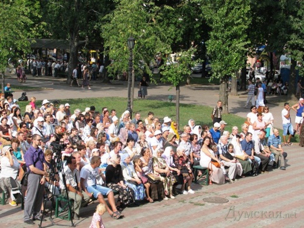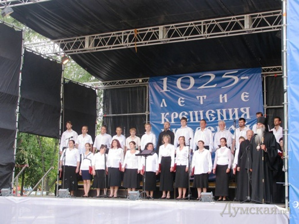 Концерт духовной музыки, приуроченный к 1025-летию Крещения Руси, начался на Соборной площади Одессы, у стен кафедрального Спасо-Преображенского собора. Выступает митрополичий хор Одесской епархии (регент – Маркив Михаил Федорович). Открыла концерт «Стихира русским святым» — старинный напев Киево-Печерской лавры. Также звучали произведения Николая Лысенко, Николая Леонтовича и одесских композиторов, в частности Серафима Орфеева. Музыкальный коллектив митрополичьего хора считается самым профессиональным в Украинской православной церкви. Истоки его создания ведут к основателю одесской Южноукраинской хоровой школы, профессору Одесской консерватории Константину Пигрову. Все 30 участников хора – выпускники Музыкальной академии им. Неждановой, многие в разное время были солистами оперной сцены. Напомним, 1025-летие Крещения Руси отмечается на национальном уровне по инициативе президента Украины Виктора Януковича. Фото пресс-службы горсовета СМЕРТЬ РОСІЙСЬКИМ ОКУПАНТАМ! Помітили помилку? Виділяйте слова з помилкою та натискайте control-enter |