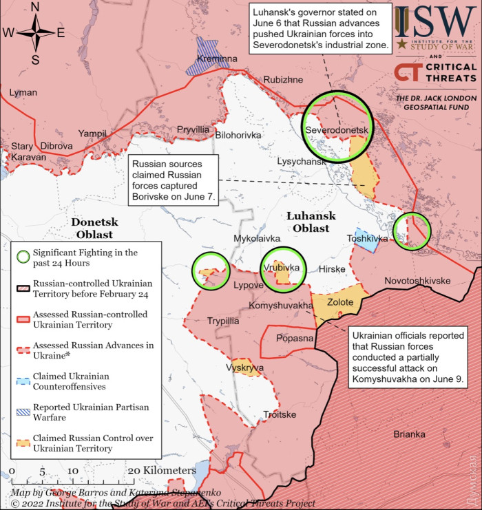 110 дней Украинского Сопротивления: почти отрезанный Северодонецк, активизация россиян на море и одесский секс-скандал с выдуманной повесткойЗавершаются 110-е сутки героического сопротивления украинского народа полномасштабному российскому вторжению. Самая горячая точка на карте Украины все та же — Северодонецк. Там ведутся кровавые бои, россияне постепенно выдавливают наших защитников из города в соседний Лисичанск, который тоже страшно обстреливают. За последние дни противнику удалось продвинуться к северо-востоку от Северодонецка, заняв населенные пункты Вороново и Метелкино, однако из последнего его выбили. Сегодня россияне, правда, добились нового успеха и вошли в центр временной столицы Луганщины. Позавчера артиллерия противника разрушила второй из трех мостов через Северский Донец, соединяющих две главные части Северодонецко-Лисичанской агломерации, а сегодня добила последний, третий. Грозит ли нашим силам окружение, непонятно. Как бы то ни было, трасса на Бахмут все еще контролируется Действующей Армией. Однако ее почти не используют из-за сильных обстрелов. На изюмском направлении враг продолжает попытки продвинуться в направлении Барвенково, бьется в «треугольнике смерти», как окрестили территорию между селами Долгенькое-Долина-Курулька. В свою очередь Силы обороны стараются подрезать с севера образовавшийся в результате этой активности врага выступ. Вчера там освободили три села. Весьма любопытное сообщение сделал Генштаб Вооруженных сил: мол, противник окапывается возле села Новый Бурлук. Почему это важно? Новый Бурлук находится на восточном берегу Северского Донца, недалеко от критически значимых для оккупантов коммуникаций. Похоже, там украинские силы наступают. Однако с какими результатами, неизвестно. С другой стороны, есть непроверенная информация о выходе россиян на окраины Старого Сатлова, который на западном берегу. Туман войны Тяжело в районе Святогорска. Там, похоже, россиянам все-таки удалось переправиться через реку и закрепиться на южном берегу, создав угрозу окружения группировки Вооруженных сил, которая обороняется в том районе. А вот в Запорожской области противник отходит, отдавая Силам обороны все новые ранее занятые населенные пункты. Областная военная администрация говорит о том, что освобождена полоса шириной почти десять километров в направлении Мелитополя. Параллельно разворачиваются какие-то события в Херсонской области. Конечно, там все не так радужно, как информирует Арестович — серьезного контрнаступления в степях нет. Наши корреспонденты, которые находятся на месте событий, сообщают, что боевые действия сводятся к обмену артиллерийскими ударами. В последние несколько суток они стали интенсивнее, россияне даже использовали фосфорные боеприпасы. Активизировались боевые действия на море. Россияне продолжают удерживать остров Змеиный, разместили на части надводных кораблей зенитно-ракетные установки «Тор» (вынужденная мера, связанная с утратой «Москвы»), а еще заняли Кинбурнский полуостров. В начале июня, по данным «Думской», возле последнего маневрировал украинский десантный корабль «Юрий Олефиренко», который сумел, во-первых, избежать попадания вражеских ракет, а во-вторых, сам нанес по противнику мощный удар. Точной информации о последствиях боя нет, но, по