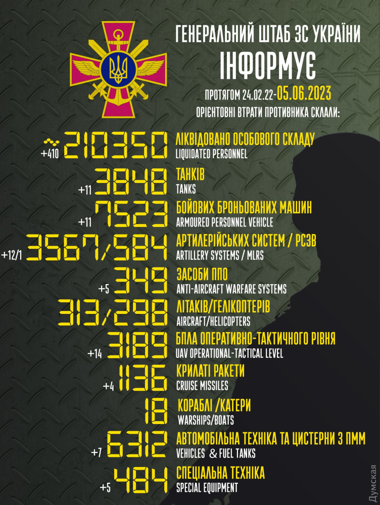 12 артсистем, п`ять систем ППО та 410 окупантів знищили Сили оборони України за добу410 російських нацистів ліквідовано в Україні 4 червня. Від початку повномасштабного вторгнення ворог втратив уже 210 тисяч 350 солдатів і офіцерів. За даними Генштабу Збройних сил України, також учора наші воїни спалили 12 артилерійських систем (3567 за весь час) і одну реактивну систему залпового вогню (584) противника. Крім того, вдалося вразити п'ять систем ППО (349). Також було підбито 11 танків (3848) і 11 бойових броньованих машин (7523), знищено сім вантажівок і автоцистерн (6312), п'ять одиниць спецтехніки (484). ППО збила чотири крилаті ракети (1136) і 14 безпілотників оперативно-тактичного рівня (3189). СМЕРТЬ РОСІЙСЬКИМ ОКУПАНТАМ! Помітили помилку? Виділяйте слова з помилкою та натискайте control-enter |