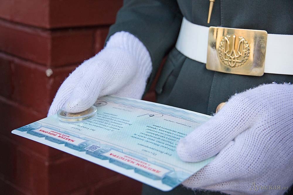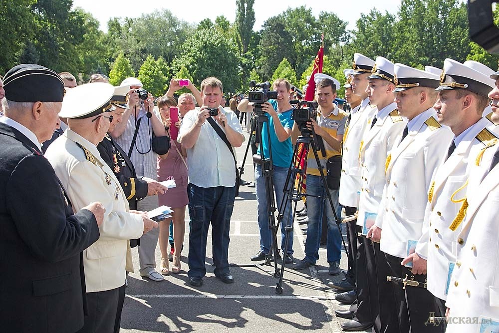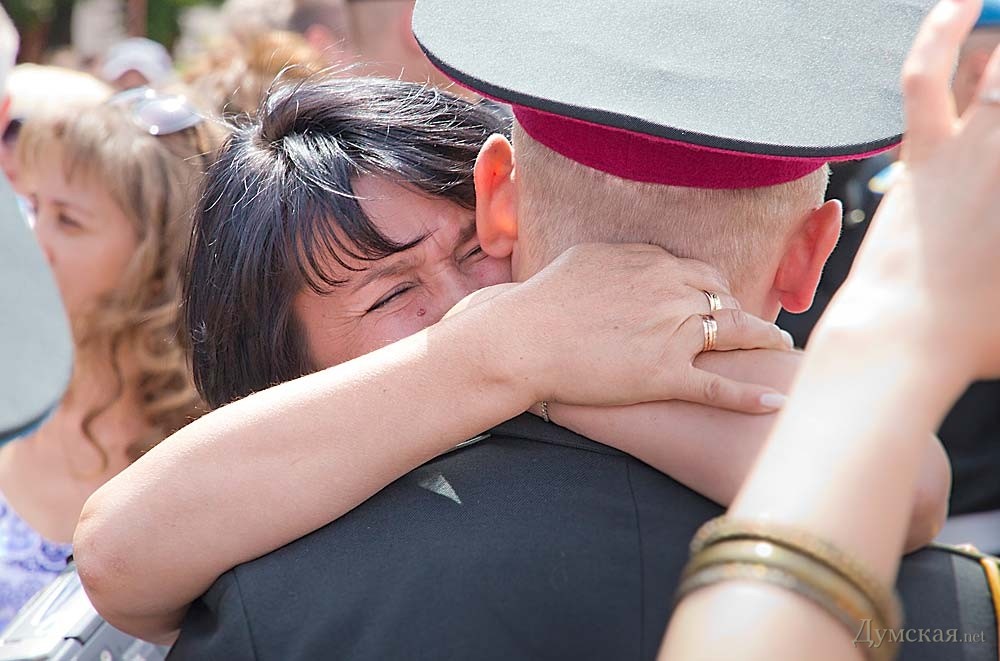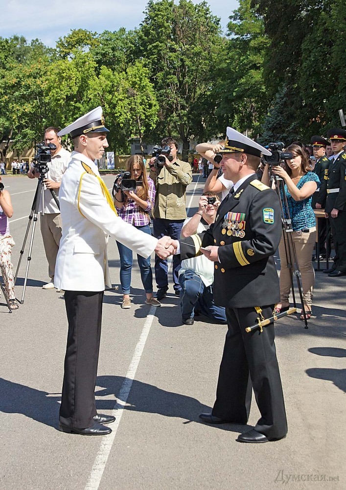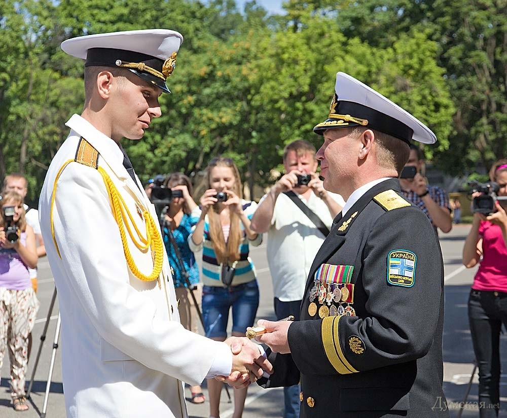 28 из них окончили учебу с отличием, а двое — «сухопутчик» Игорь Пустовит и моряк Дмитрий Руднев — с золотой медалью. В церемонии выпуска принял участие командующий ВМС Украины контр-адмирал Сергей Гайдук, а также руководители города и области. Пришли поздравить новоиспеченных лейтенантов и ветераны-подводники, вручившие молодым офицерам медали в честь 100-летия Маринеско. «Сегодня у нас в Академии праздник, — заявил начальник Военной академии генерал-майор Олег Гуляк. — В одном строю стоят десантники, разведчики, моряки, специалисты вооружения, тыла, которые продолжат службу в разных уголках нашей страны. Уверен, что за годы обучения вы получили необходимые знания, чтобы стать настоящими лидерами воинских коллективов». «Долгожданные звезды, которые вы получили сегодня, завтра станут для вас высокой ответственностью за принятые решения, за личный состав и за выполнение боевых заданий, — подчеркнул командующий национальным флотом Сергей Гайдук. — Перед нами стоит одна главная цель – это защита суверенитета нашей страны, защита нашего народа». «Этот выпуск особенный, так как сейчас на территории нашей страны идут боевые действия, и часть вчерашних курсантов примут в них участие, — подчеркнул мэр Одессы Геннадий Труханов. — На ваши плечи ложится боевая задача любой ценой отстоять целостность и суверенитет нашего государства». Фото Александра Гиманова