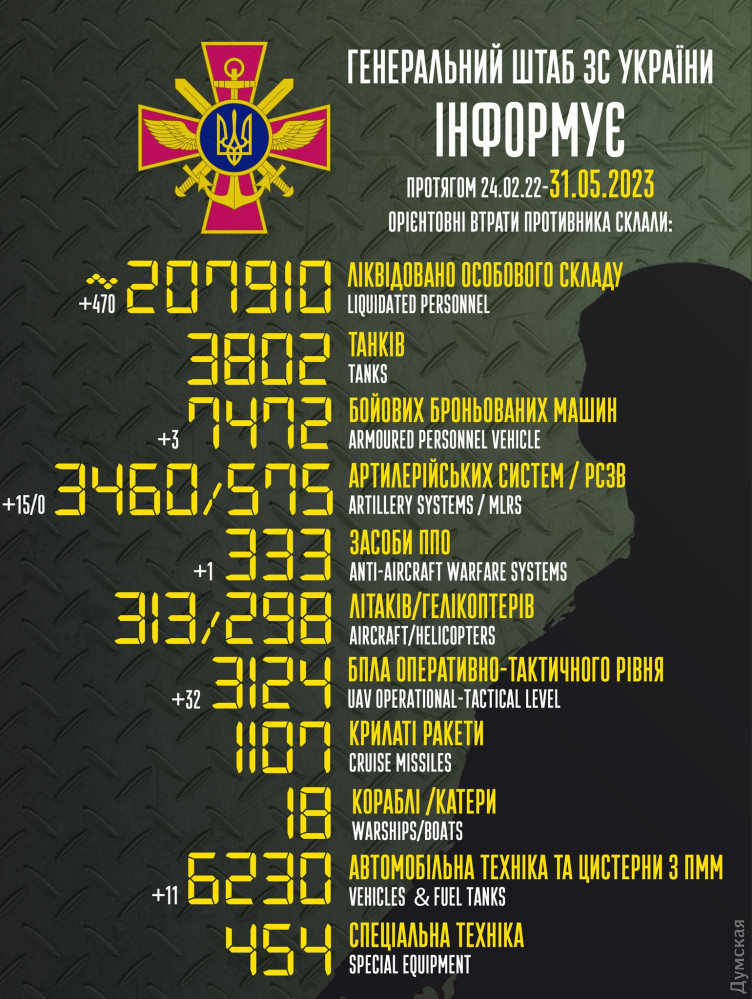 Ще 470 російських солдатів були «демілітаризовані та денацифіковані» в Україні 30 травня. За час повномасштабного вторгнення противник втратив уже 207 тисяч 910 своїх військових.