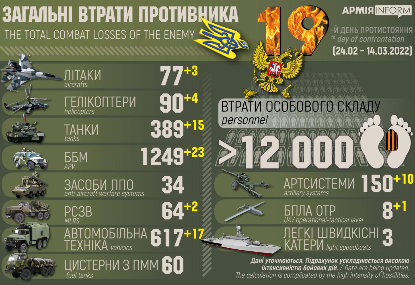 За сутки российские нацисты потеряли в Украине 15 танков и три самолета (инфографика)Тысячи единиц военной техники противника уничтожены или стали трофеями украинских военных. Более двенадцати тысяч оккупантов убиты, ранены или в плену. Генштаб Вооруженных сил Украины приводит данные по потерям российских нацистов — общие и за последние сутки. Уничтожены или стали трофейными 389 танков (+15 за сутки) и 1249 боевых бронированных машин (+23), 150 единиц артиллерии (+10) и 64 (+2) реактивные системы залпового огня, 33 средства противовоздушной обороны, 77 самолетов (+3) и 83 вертолета (+4), 617 автомобилей (+17), два катера и один корабль, 60 цистерн с горючим, восемь беспилотников оперативно-тактического уровня (+1). СМЕРТЬ РОСІЙСЬКИМ ОКУПАНТАМ! Помітили помилку? Виділяйте слова з помилкою та натискайте control-enter |