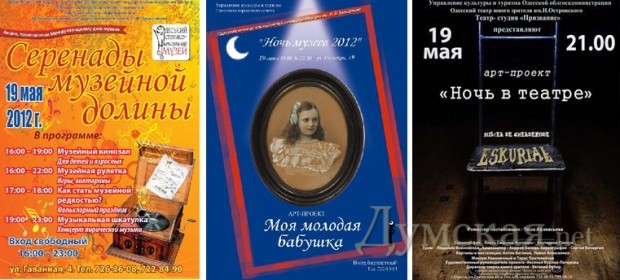 19 мая в Одессе пройдёт традиционная «Ночь музеев», которая приурочена к Международному дню этих учреждений. Таким образом одесские музеи присоединятся к более чем двум тысячам заведений из 42 стран Европы, которые откроют свои экспозиции для посещения в вечерне-ночное время. Так музеи привлекают молодых зрителей, которым более привычно посвящать досугу вечер, чем день. В частности с 16:00 до 23:00 Одесский историко-краеведческий музей проведёт акцию «Серенады музейной долины». В этот вечер всех гостей учреждения ждёт кинозал для детей и взрослых, где покажут художественные фильмы и мультфильмы, связанные с музеями. После этого пройдут игры и викторы, а также концерт лирической музыки. Вход бесплатный.