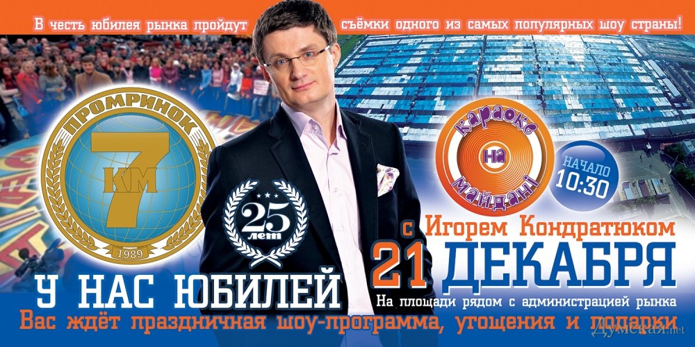 21 декабря «Седьмой километр» отметит свой четвертьвековой юбилей с «Караоке на Майдане» (на правах рекламы)21 декабря промтоварный рынок «Седьмой километр» отмечает свой 25-летний юбилей. Центральным событием празднования станет проведение на территории рынка одного из самых популярных песенных шоу страны «Караоке на Майдане» с его бессменным ведущим Игорем Кондратюком. Отметить вместе 25-ю годовщину рынка и принять участие в записи программы приглашаются все желающие, особенно те, кто любит и умеет петь. Стоит отметить, что последний раз программа «Караоке на Майдане» с Игорем Кондратюком гостила в Одессе 5 лет назад, в 2009 году. И вот теперь вновь все поклонники этой программы, и караоке в целом, смогут поучаствовать в записи двух программ любимого шоу, которое покажут по телеканалу СТБ в январе и феврале. Шоу «Караоке на майдане» стартует в воскресенье, 21 декабря, в 10:30, на центральной автостоянке рынка, неподалеку от администрации. В перерывах зрителей ждет праздничная программа. Победители и финалисты «Караоке на Майдане» получат не только традиционные поздравления от программы, но и ценные призы от юбиляра. В этот же день рынок приготовил для всех бесплатный въезд на рынок и множество сюрпризов. С 21 до 28 декабря на «7 км» будут проходить ежедневные народные гуляния – танцы, файер-шоу, представления мыльных пузырей и ростовых кукол, сказочные герои и настоящее новогоднее настроение. Всю неделю гостей «7-го километра» ждут бесплатные горячие напитки и угощения, для посетителей приготовлено более 50 тысяч подарков и сувениров. Приглашаем отпраздновать юбилей рынка и Новый год вместе с нами! Кстати, 1, 2, а также 7, 8 и 9 января на «7-м километре» объявлены выходными днями. В остальные дни рынок работает по обычному графику: Пн-Чт: с 6.00 до 15.00, Сб-Вс: с 6.00 до 16.00. Пятница – всегда выходной. ООО «Промтоварный рынок» — крупнейший оптово-розничный промтоварный рынок в Европе, предоставляет услуги аренды, парковки, охраны. Адрес: Одесская область, Овидиопольский район, пгт Авангард, ул. Базовая, 20. Только застроенная площадь составляет свыше 75 га. На рынке работают около 60-ти тысяч человек, 15 тысяч торговых и складских объектов (магазины, павильоны, контейнеры, склады), 8 автостоянок. На территории функционируют: отделение милиции, собственные пожарная часть, 3 медпункта и скорая помощь, 2 гостиницы и автостанция, а также банк, разветвленная сеть общественного питания. Ежедневно промтоварный рынок «Седьмой километр» посещают около 200 тысяч человек. СМЕРТЬ РОСІЙСЬКИМ ОКУПАНТАМ! Помітили помилку? Виділяйте слова з помилкою та натискайте control-enter |