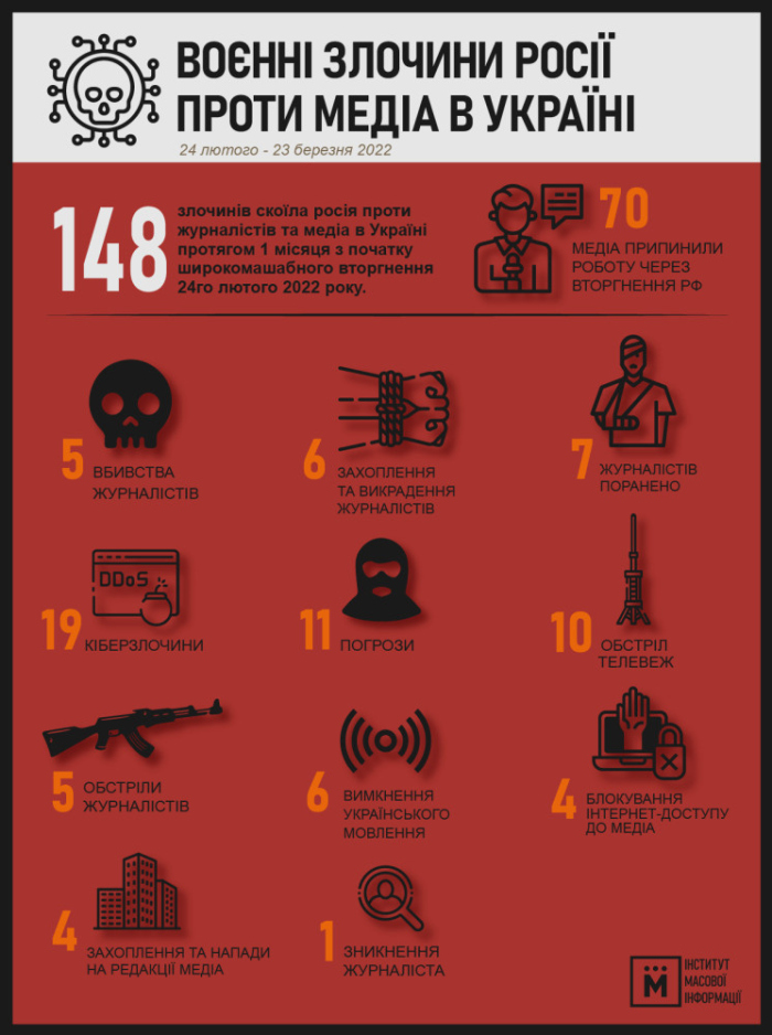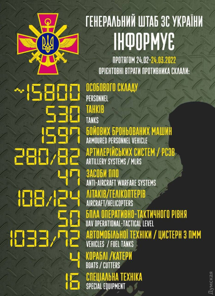 Месяц Украинского Сопротивления: успешные контрудары, зверства российских нацистов и посевная (обновляется)Продолжается открытое нападение РФ на Украину, которое Путин начал 24 февраля в 5 утра. Хроника вчерашнего дня боев — по ссылке. ОБНОВЛЕНО В 23:44. 24 марта сработали все семь согласованных гуманитарных коридоров для эвакуации граждан из населенных пунктов, в которых ведутся боевые действия. По ним удалось эвакуировать 3343 человека. ОБНОВЛЕНО В 21:57. Генеральный штаб Вооруженных сил Украины обнародовал сводку о ситуации на фронтах российско-украинской войны по состоянию на 18:00. ОБНОВЛЕНО В 21:22. За сегодняшний день российские нацисты обстреливали Одесскую область с корабельной артиллерии и крылатыми ракетами. Об этом заявил в своем обращении к жителям области глава Одесской ОВА Максим Марченко. Все снаряды упали в море, а ракету сбила украинская ПВО, уточнил он. «Сегодня дал указания организовать как следует работу «Укрпочты» и «НовойПочты», чтобы не было преград в отправке и получении почтовых отправлений. Также поручил усовершенствовать работу автобусных пригородных маршрутов. Тихой вам ночи! Все будет Украина!» — добавил глава Одесской ОВА. ОБНОВЛЕНО В 19:30. Российский истребитель-бомбардировщик Су-34 и беспилотник сбила противовоздушная оборона ВС Украины на харьковском направлении. Об этом сообщили в Воздушном командовании «Восток». «Они упали», — скромно добавили украинские военные. ОБНОВЛЕНО В 19:15. Тела военнослужащих Вооруженных сил Украины, которые погибли в результате ракетного обстрела российскими нацистами казармы в Николаеве, привезли сегодня в Одесскую область. Это 20-летний Виталий Баргилевич из Степового, 29-летний Иван Быков из Сухого Лимана, 29-летний Юрий Нерубайский из Таировской ОТГ, 42-летний Николай Дудка из Арциза. Погибших воинов встречали местные жители, выстроившиеся в живые цепи вдоль улиц. Вечная память и слава защитникам Украины! ОБНОВЛЕНО В 18:37. Российские «освободители» за месяц широкомасштабной войны в Украине убили пятерых журналистов, еще семерых — ранили. По данным Института массовой информации, рф совершила 148 преступлений против СМИ. «По состоянию на 24 марта пятеро журналистов убиты во время исполнения профессиональных обязанностей, семеро ранены, один журналист пропал без вести. ИМИ известно о по меньшей мере шести случаях захвата журналистов россиянами в заложники и жестокого обращения с ними»,- сообщается на платформе Института. Неизвестной остается судьба фотокорреспондента Максима Левина, который освещал боевые события под Киевом и скрылся 13 марта. Согласно данным мониторинга, вражеские войска обстреляли 10 телебашен, из-за чего в восьми регионах Украины полностью или временно исчезло теле- и радиовещание. Кроме того, минимум 70 региональных медиа вынуждены были прекратить работу из-за угроз и захвата редакций российскими оккупантами. ОБНОВЛЕНО В 18:06. Силы украинской ПВО сбили беспилотник и истребитель-бомбардировщик на Харьковском направлении. Об этом сообщают в Воздушном командовании «Схід». «Враг недосчитался 1 БПЛА и еще один истребитель-бомбардировщик Су-34. Они упали», — говорится в сообщении. ОБНОВЛЕНО В 17:50. Уже 100 тысяч американских военных находится в Европе. Кроме того, свои силы направляет на континент Великобритания и Канада. Готовятся к обороне и европейские чл