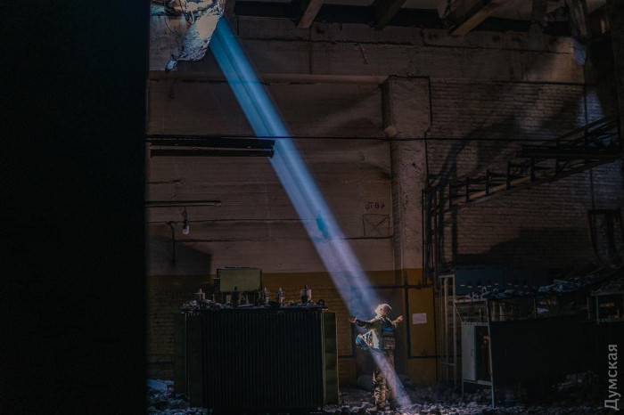 В этом помещении был пожар вследствие атаки. Спасатели до сих пор проливают.