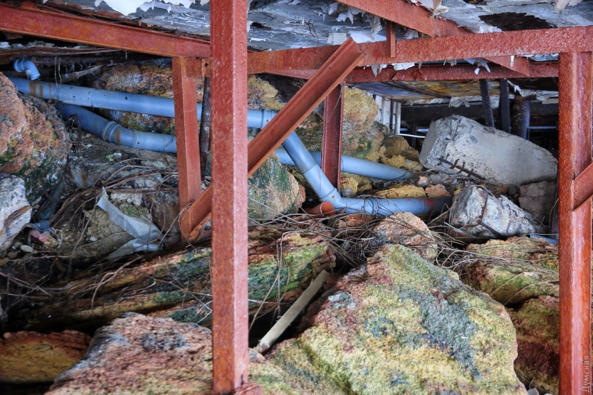 В этом помещении был пожар вследствие атаки. Спасатели до сих пор проливают.