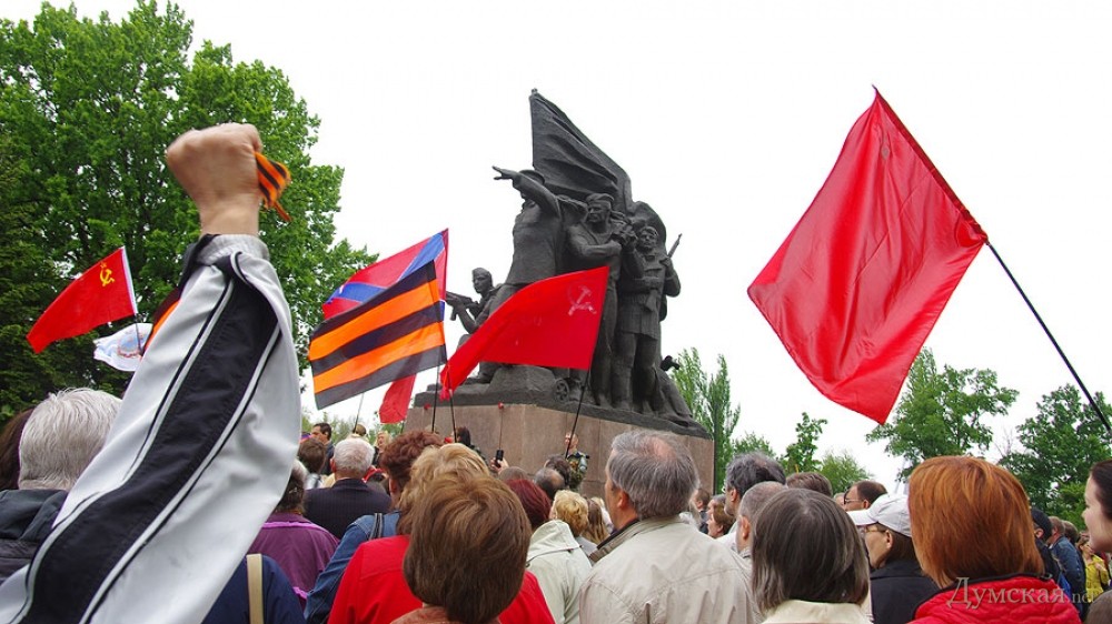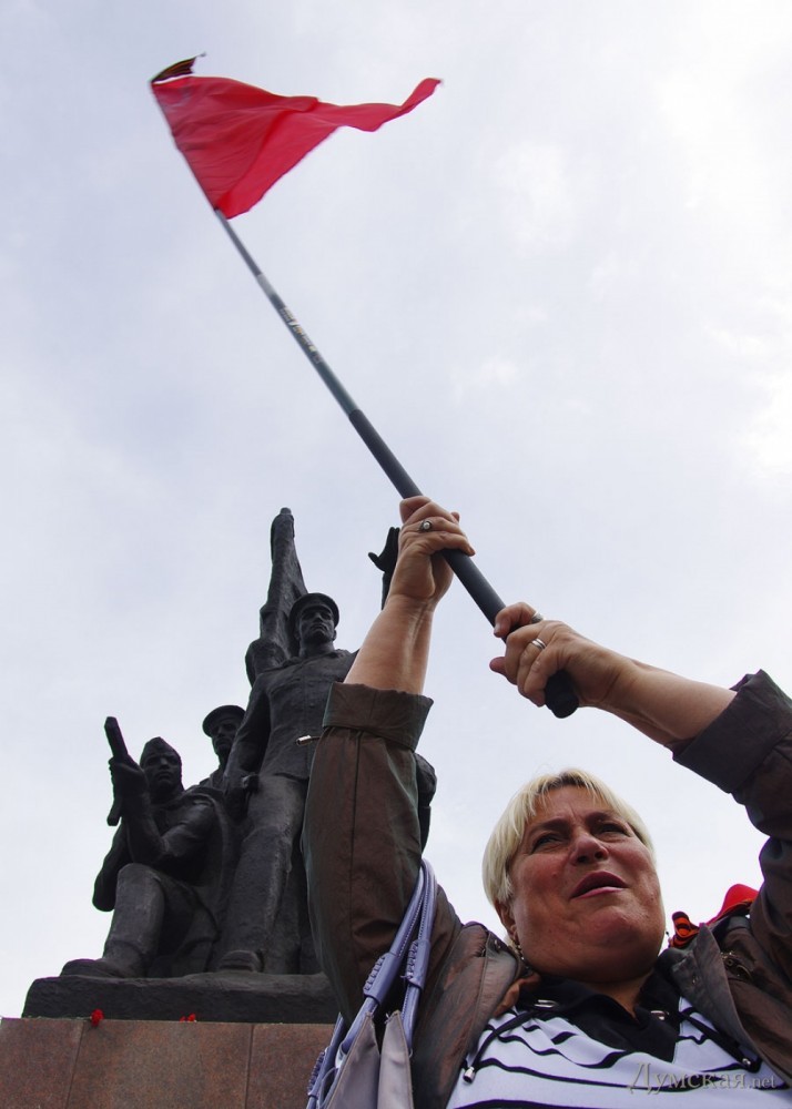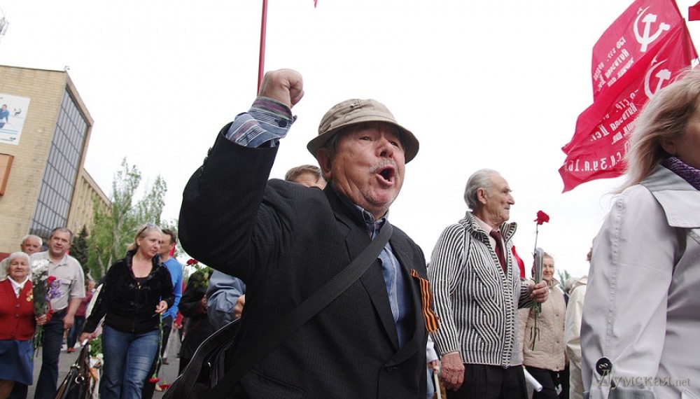 В Херсоне в Парк Славы сегодня пришли около 150 коммунистов несколько десятков потенциальных сепаратистов и человек 500 с украинскими флагами. Все проходило спокойно и для картинки российским каналам ничего не было покуда одна молодая особа с ребенком на руках не прошла к выступающему и не выбила у него из рук микрофон её бережно взяв под руки отодвинули в сторону.После пытался побуянить ещё какой-то пенсионер с георгиевской ленточкой, но провокации не получилось. В это время ветераны сидели на стульчиках и с испугом наблюдали на горстку идиотов с красными флагами. Очевидно, что 9 мая превратился из дня Памяти в пророссийский неонацистский шабаш!