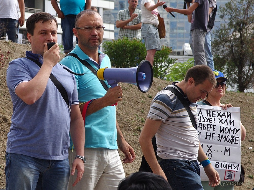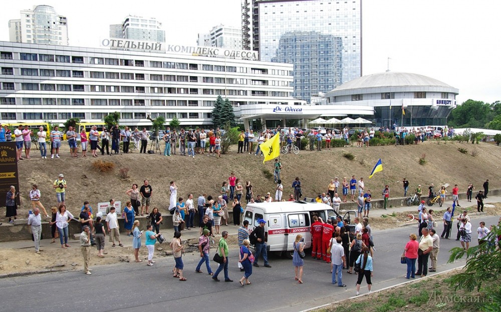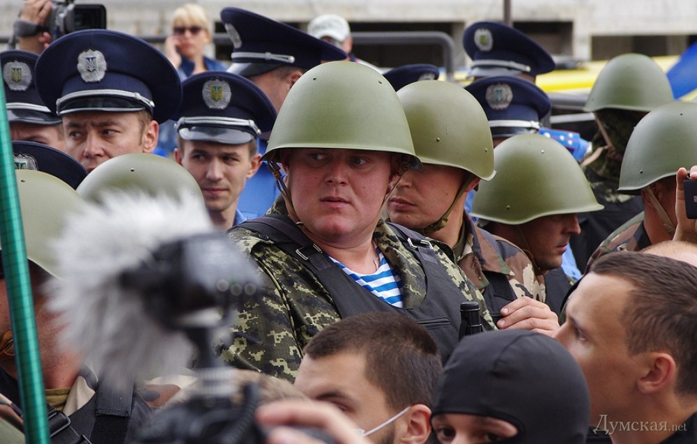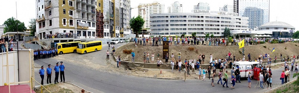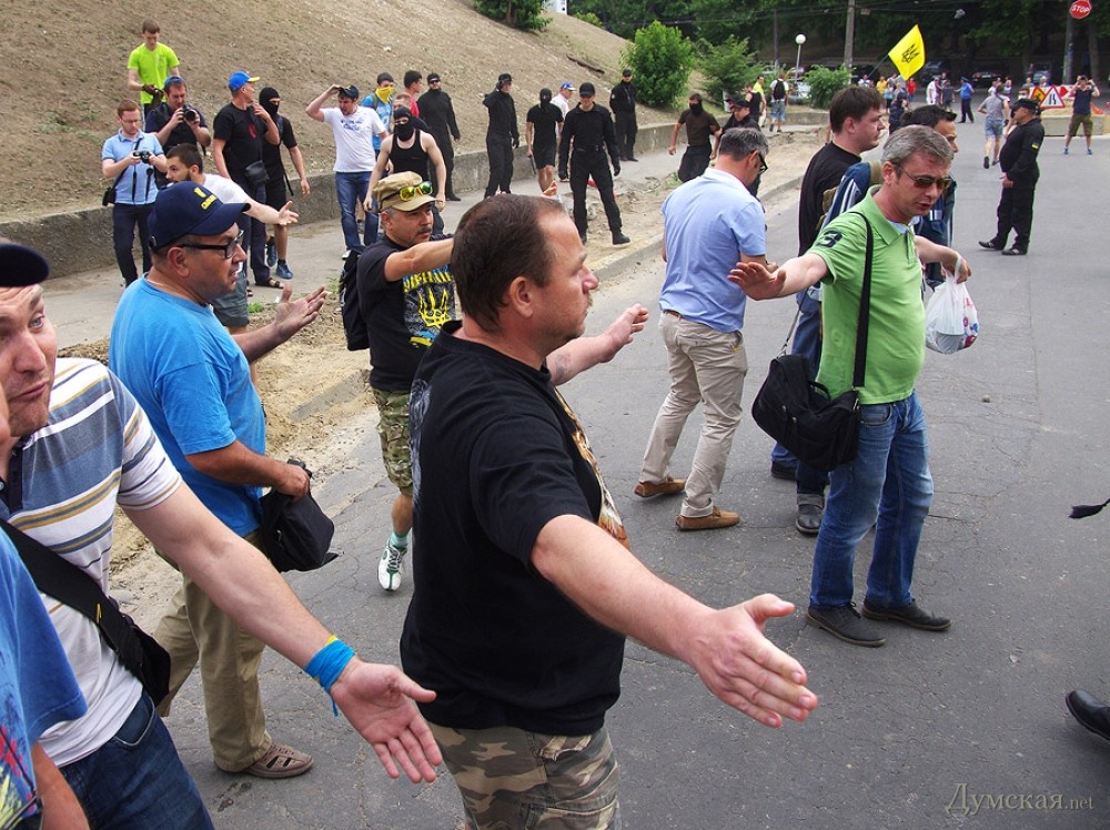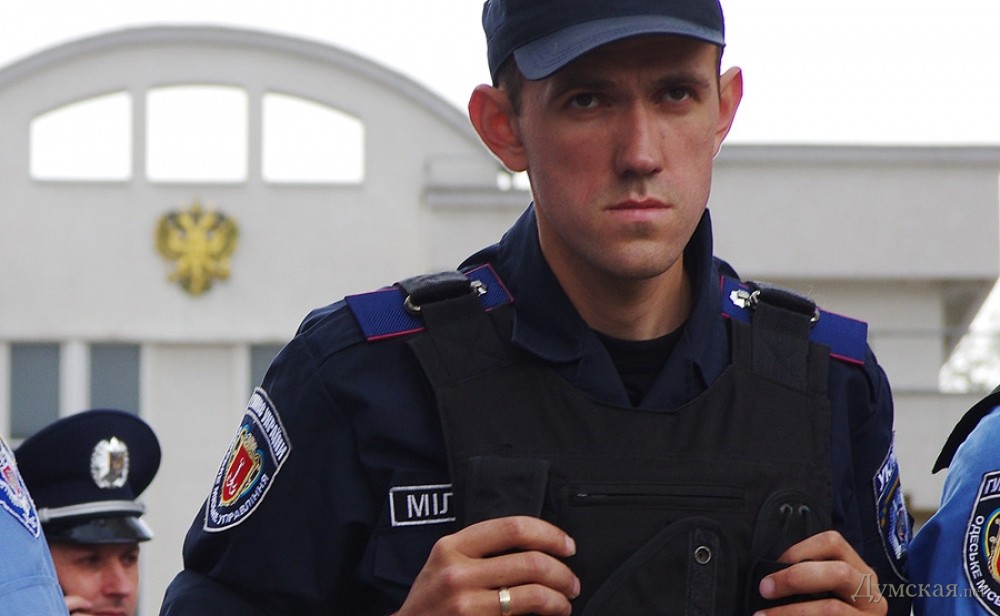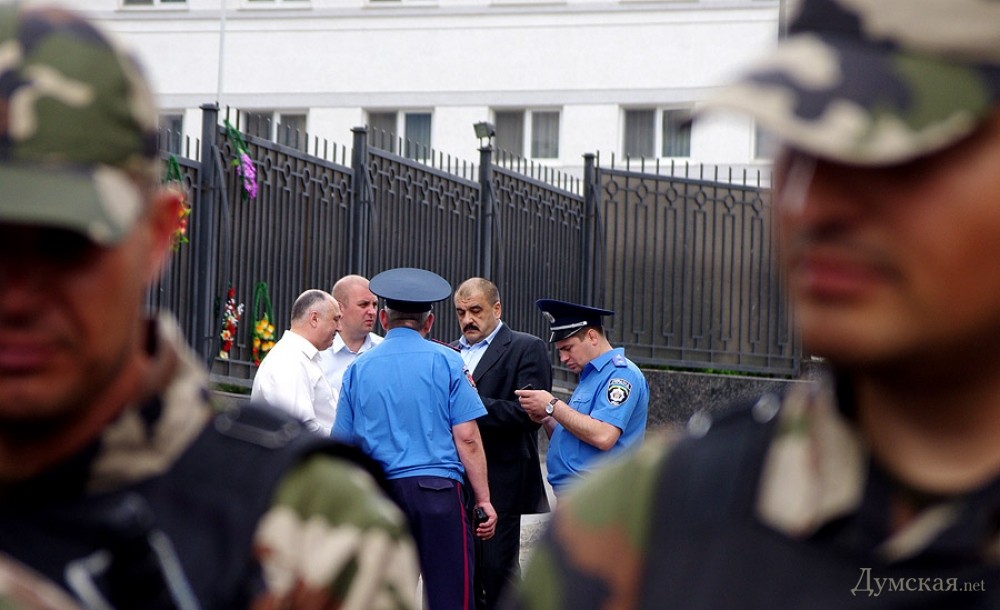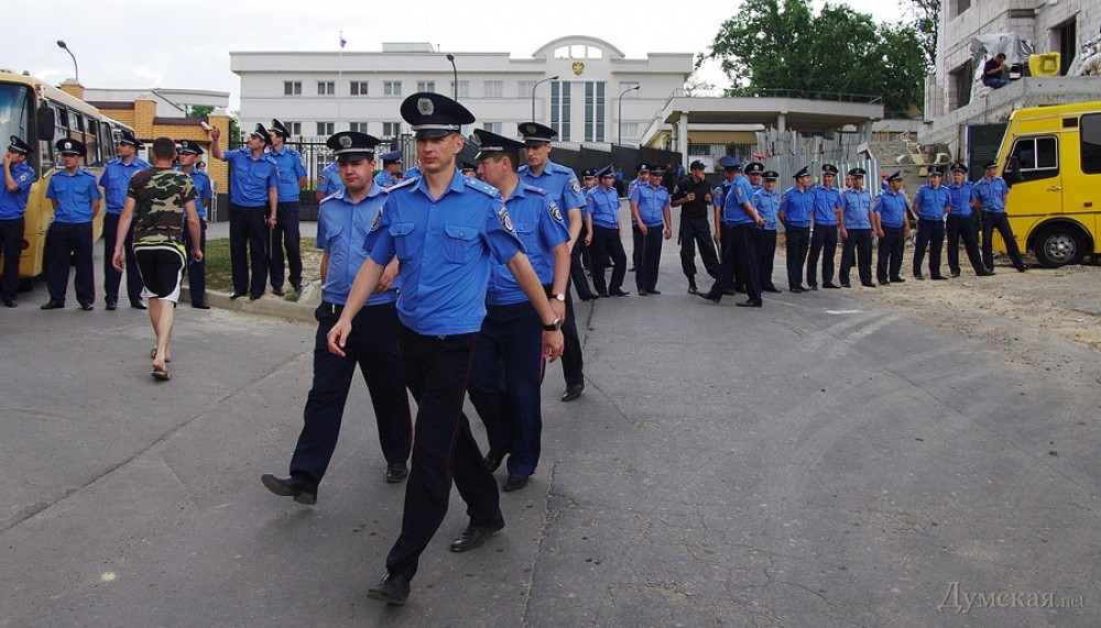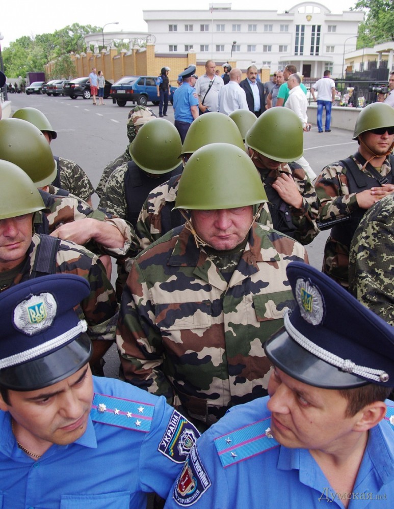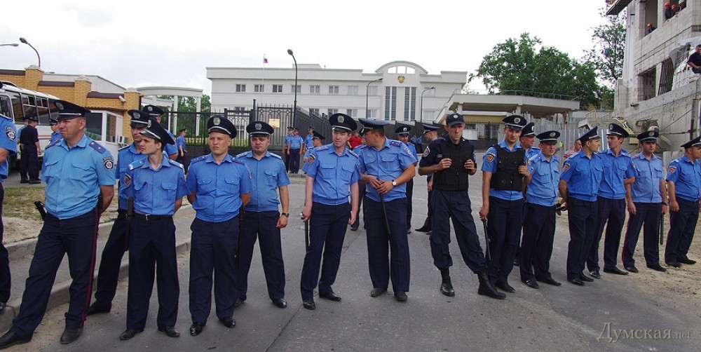 Акция по установке  поминальных венков на забор одесского представительства России — чтобы дипломаты помнили о загубленных на востоке Украины душах — была анонсирована накануне в социальных сетях. К трем часам дня в назначенном месте собрались две или три сотни проукраинских активистов. Путь к консульству им преградил кордон из милиции в обычной форме. Любопытно, что в основном охраняли посланцев Мордора консульских работников командиры: в одном ряду плечом к плечу стояли и полковники, и лейтенанты.