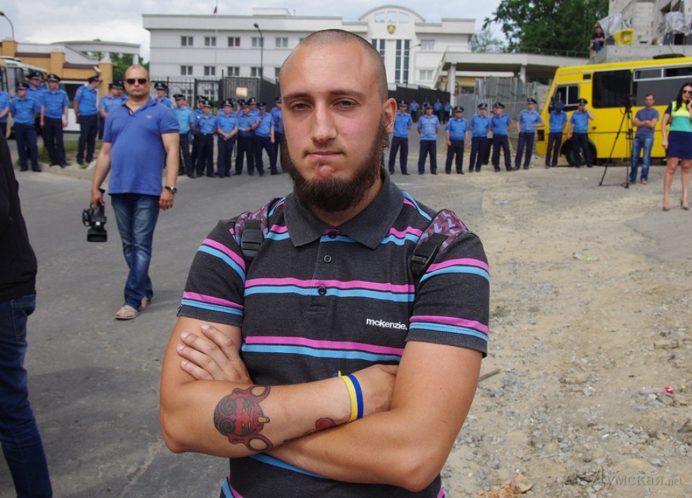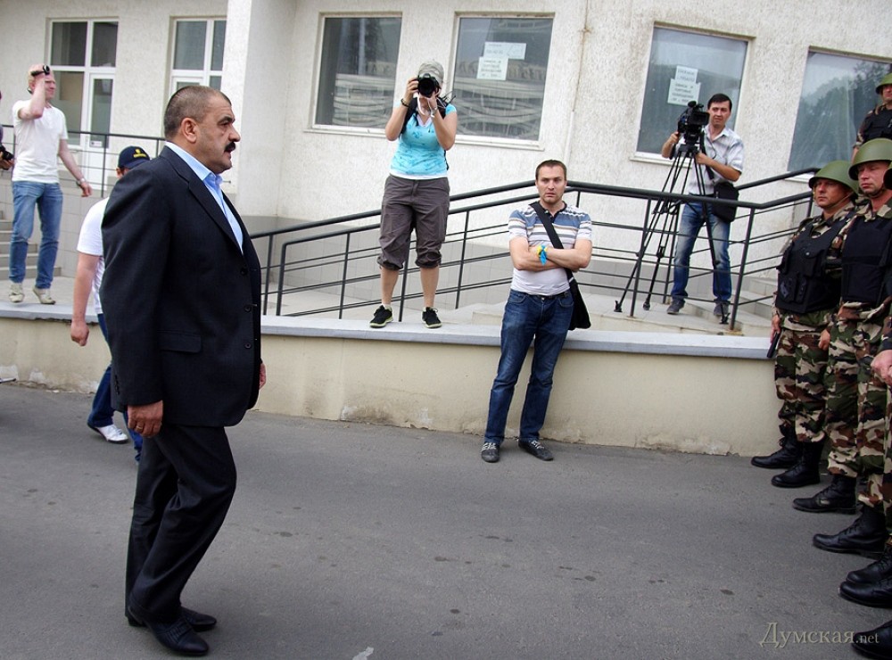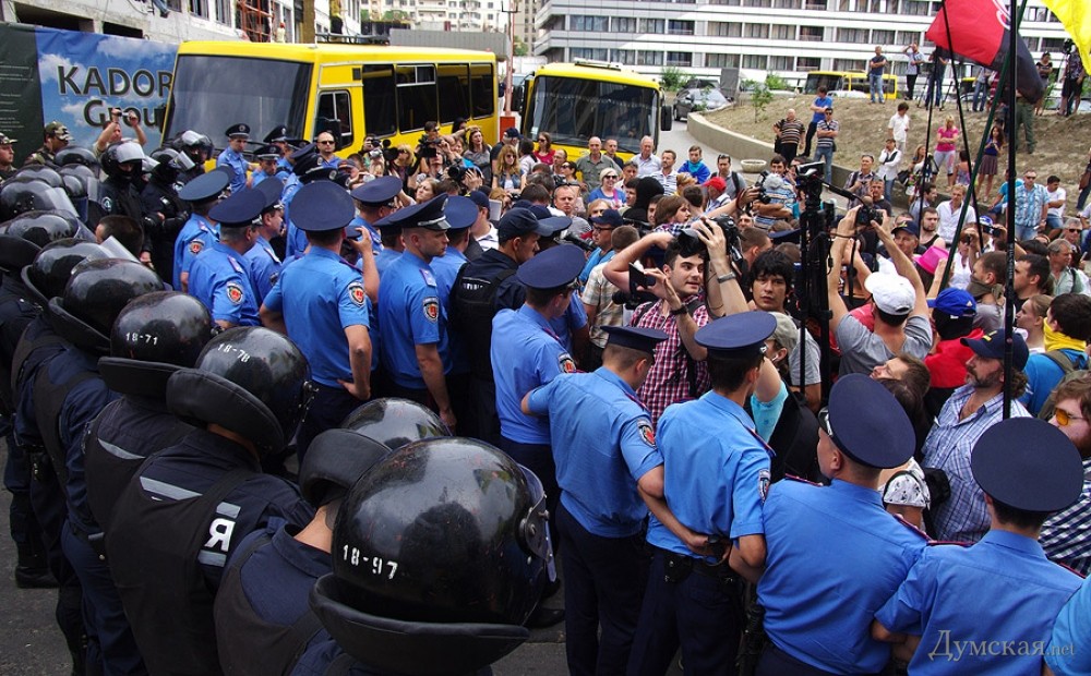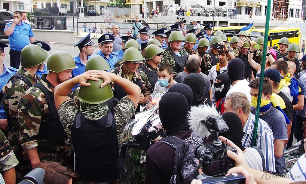 Когда, после небольшого митинга и долгих сборов подписей под петицией с требованием снять со здания оккупационный триколор, выяснилось, что кордон не намерен пропускать активистов к забору, собравшиеся начали толкаться с милицией. Та мужественно не применяла ни силы, ни спецсредств. В конце концов, чтобы снизить накал страстей, тылы правоохранителей усилили «космонавты» из Нацгвардии, а к ограде разрешили пропустить несколько человек женского пола.
