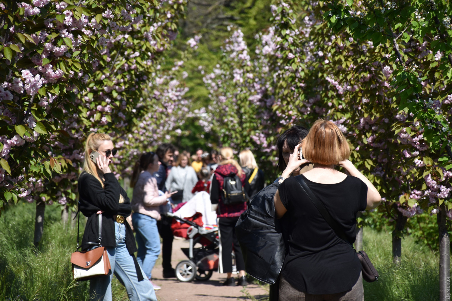 Поспособствовали небывалому нашествию охотников за яркими кадрами и селфи выходные дни и теплая погода. На входе в ботанический вот уже несколько дней подряд собирается очередь, а в самом саду взрослые и дети буквального облепили каждый уголок зеленого оазиса.