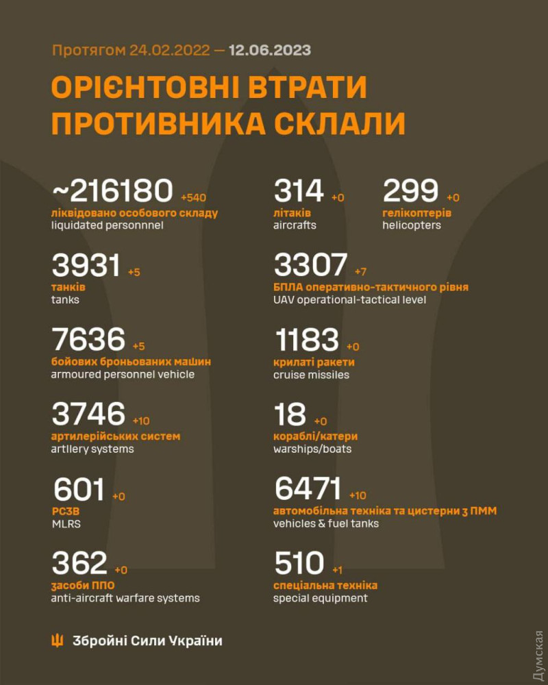 540 окупантів і десять артсистем знищили Сили оборони України за добу540 російських загарбників полягли в Україні 11 червня. За час повномасштабного вторгнення українські захисники ліквідували вже 216 тисяч 180 солдатів і офіцерів ворога. За даними Сухопутних військ Збройних сил України, також учора було підбито п'ять танків (3931 за весь час) і п'ять бойових броньованих машин (7636) супротивника, десять вантажівок і автоцистерн (6471), одну одиницю спецтехніки (510). Спалено десять артилерійських установок (3746). ППО збила сім дронів оперативно-тактичного рівня (3307). СМЕРТЬ РОСІЙСЬКИМ ОКУПАНТАМ! Помітили помилку? Виділяйте слова з помилкою та натискайте control-enter |