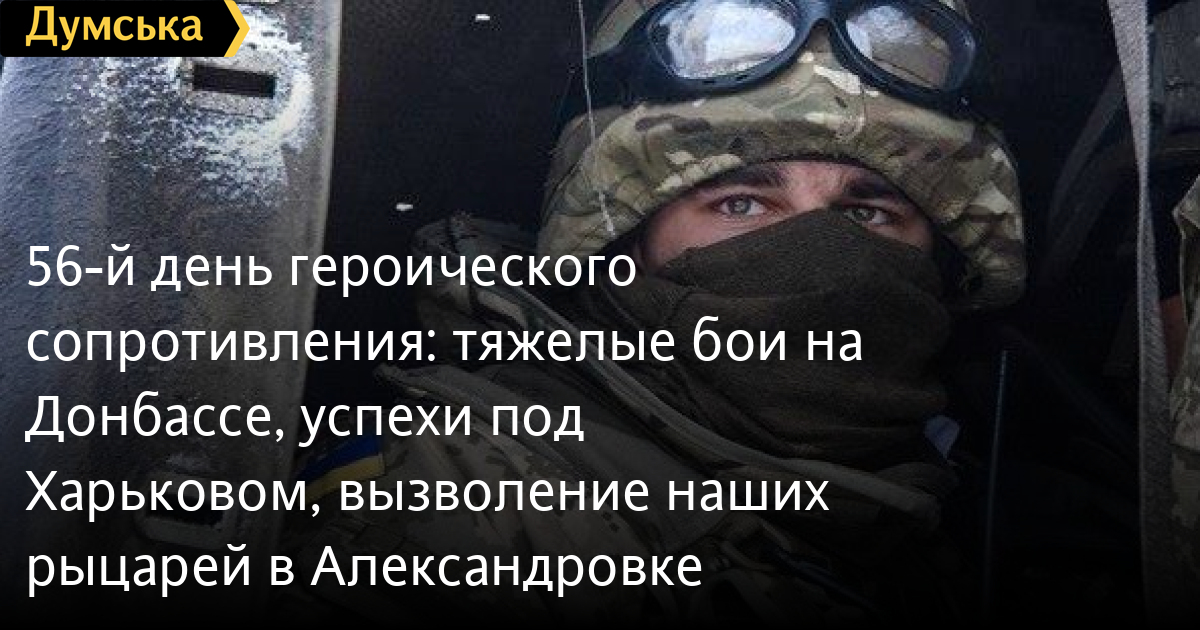 56-й день героического сопротивления: тяжелые бои на Донбассе, успехи под Харьковом, вызволение наших рыцарей в АлександровкеЗавершились 56-е сутки сопротивления украинского народа масштабному нападению российских захватчиков. «Спецоперация», которую бравые российские вояки собирались завершить за несколько дней, завязла и теперь уверенно буксует всеми колесами. «Генеральное наступление на Донбассе», которое, по всей видимости, началось вчера с масштабной артподготовки на предполагаемых участках прорыва, пока вряд ли можно назвать «стремительным» или «глубоким». Пока враг продолжает наносить авиационные удары, задействовал дальнюю авиацию, использует беспилотники для разведки. В Донецкой и Луганской областях противник девять раз атаковал, наши защитники успешно отразили эти атаки и заставили отступить. Враг собирает силы, идут бои за Попасную и Рубежное, в районе Новотошковского его наступление оказалось неудачным. Еще один удар оккупанты пытаются нанести в районе Изюма, там продолжается переброска вражеских войск, противник формирует вертолетный кулак в Белгородской области. Обнаженным нервом остается Мариуполь. Враг явно намерен сравнять с землей «Азовсталь», где держат оборону наши герои и укрылись тысячи мирных горожан. Все попытки прекратить эту бойню путем переговоров и политическими усилиями лидеров разных стран пока безуспешны. В Харьковской области продолжаются бои, но наши защитники постепенно вытесняют захватчиков к границе, освобождают украинские села и поселки. Отношение стран Европы к событиям в Украине постепенно меняется. После вчерашнего «дня артиллерии», когда США, Канада и Великобритания заявили о скорых поставках в Украину тяжелых артсистем, к поставкам серьезного вооружения присоединяются и другие союзники. В частности, Норвегия передала Украине сто зенитно-ракетных комплексов. Подключаются и частные структуры: вслед за «Старлинком» о поддержке Украины заявила фирма АeroVironment, которая подарит нашей армии сто новейших разведывательных беспилотников. Конечно, поставки оружия очень нужны Украине, и мы благодарны союзникам за помощь. В Одесской области уже собираются назвать одну из улиц именем Бориса Джонсона, который стал настоящим локомотивом военной поддержки Украины и личным примером не дает расслабиться другим странам НАТО и другим нашим союзникам. С другой стороны, нужно признать: если бы наступательное вооружение передали нам месяц назад, это бы сохранило тысячи жизней. А если бы поставки оружия начались два месяца назад — возможно, это позволило бы вообще предотвратить эту войну. В любом случае, похоже, военная помочь Украине со стороны союзников — это лучшая и самая эффективная гарантия нашей безопасности, которая только может быть. Как говорится, «хочешь мира — готовься к войне». Помимо военной помощи, продолжается и экономическое давление. Евросоюз все отчетливее озвучивает планы полного отказа от импорта российских энергоносителей. В Киев возвращаются посольства 18 стран, и это важный дипломатический сигнал: они, как и мы, тоже доверяют Вооруженным силам Украины. Ситуация на юге Украины остается сложной. На оккупированных территориях враг намерен провести псевдореферендумы и готовит принудительную мобилизацию наших граждан, чтобы заставить их воевать против родно