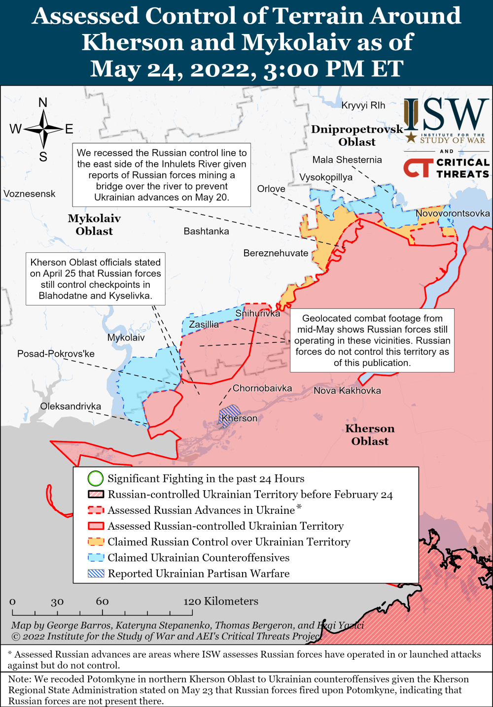 91-й день войны: оккупанты продолжают наступление на Донбассе и активизировались на югеЗаканчивается 91-й день полномасштабного российского вторжения в Украину. Оккупантам пока не удалось достичь ни одной заявленной цели войны. Даже на Донбассе за прошедшие сутки врагу не удалось переломить ситуацию. И тем не менее, увы, в последние дни у нас мало хороших новостей с фронтов. Но попробуем спокойно и взвешено взглянуть на карту военных действий и проанализировать происходящие там события. Начнем с Луганской области, где сейчас идут наиболее ожесточенные столкновения с российской ордой. Несмотря на ранее наметившиеся успехи российских войск, пока что им не удалось прорваться к Северодонецку и Лисичанску – последним оплотам независимой Украины в регионе. По данным британской разведки, наши защитники удерживают противника примерно на расстоянии 25 километров от городов, продолжаются ожесточенные позиционные бои. Утром главный редактор «Цензор.НЕТ» Юрий Бутусов сообщил, что еще вчера захватчикам удалось прорваться к «дороге жизни» — стратегически важной трассе, которая соединяет Лисичанск и Бахмут. По его словам, враги перекрыли движение по дороге, что условно можно считать оперативным окружением украинской группировки в Северодонецко-Лисичанской агломерации. Официально эта информация не подтверждается. По словам главы Луганской областной военной администрации Сергея Гайдая, обстановка на трассе за последние сутки существенно не изменилась. Дорога простреливается врагами, но открыта для движения и утром по ней даже удалось доставить в Северодонецк гуманитарные грузы. Военные аналитики также не фиксируют какого-то критического изменения ситуации на этом участке фронта. Скорее всего, сил противника пока недостаточно для развития прорыва с попаснянского плацдарма. Американский Институт по изучению войны отмечает, что план российской операции по захвату Донбасса в очередной раз претерпел корректировки и скукожился. Вместо и без того весьма скромных планов захлопнуть украинскую группировку войск в окружение примерно по линии Северск – Бахмут российское командование решило организовать четыре отдельных мини-«котла»: в районе Северодонецка, Бахмута, Золотого (к северо-востоку от Бахмута) и Авдеевки. Аналитики констатируют, что, несмотря на весьма угрожающую динамику развития боев в этой местности, россияне пока что «не достигли каких-либо крупных прорывов и не достигли значительного прогресса в достижении заявленных целей». Как вы могли заметить, в официальных сводках и наших материалах стали гораздо реже фигурировать названия населенных пунктов Изюм и Барвенково. Наступление, которое оккупанты изначально пытались проводить на этом направлении (в сторону Славянска), оказалось им не по зубам и от продолжения операции пришлось практически отказаться, перебросив все стоящие в этом районе боеспособные подразделения под Северодонецк. Процитируем Институт по изучению войны еще раз: «За прошедшую неделю российские войска достигли больших успехов, чем за период с начала мая. Но их продвижение остается медленным, ограничивается меньшими целями и сталкивается с продолжающейся украинской обороной, это не является крупным прорывом». Хотелось бы верить, но сегодня мы в «осторожный оптимизм» играть не настроены. Кон