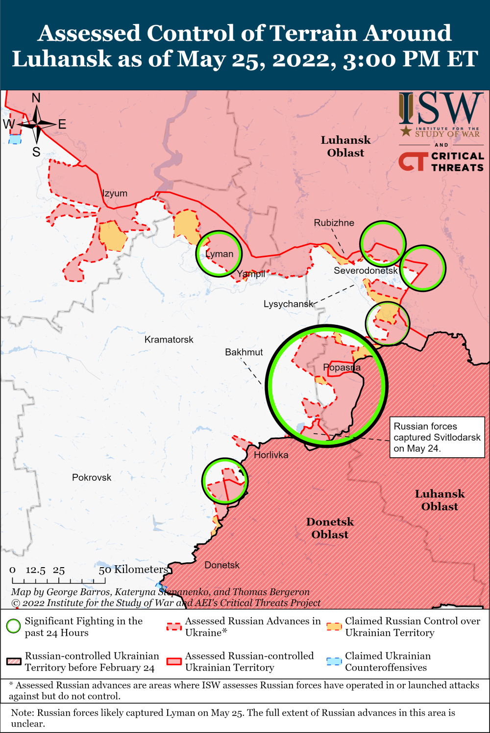 Заканчиваются 92-е сутки полномасштабного российского вторжения в Украину. Главным полем битвы, по-прежнему, остаются восточные регионы. На остальных направлениях сегодня было затишье. Самое горячее место — Луганская область, где противник не оставляет попыток захватить Северодонецко-Лисичанскую агломерацию и уничтожить закрепившуюся там группировку украинских защитников. Вечером бои велись на окраинах Северодонецка. Кроме того, эти города постоянно подвергаются артиллерийским и авиационным ударам. Юго-восточнее и юго-западнее ситуация несколько ухудшилась. Российским подразделениям, наступающим на Боровское (восточнее Лисичанска), удалось продвинуться в районе Устиновки. Утром глава Луганской областной военной администрации Сергей Гайдай сообщил, что накануне вражеское подразделение из состава так называемой попаснянской группировки войск рф сумело оседлать «дорогу жизни» Лисичанск-Бахмут, которая связывает агломерацию с «большой землей». Россияне даже попытались на ней закрепиться и организовали блокпост. Однако эти наспех оборудованные полевые укрепления были сметены огнем украинской артиллерии, после чего Силы обороны нанесли контрудар и сбросили оккупантов с дороги. Тем не менее она сейчас находится под плотным вражеским огнем (это еще не огневой контроль, но близко к нему). Россияне пристрелялись и существенно затруднили проезд. По словам Гайдая, шансов прорваться по трассе сейчас не более 20%. В целом же попаснянская группировка пытается наступать сразу в трех направлениях: на запад — в сторону Бахмута и находящегося возле него Соледар, на юго-запад — с целью отрезать от основных сил украинские подразделения, отходящие из Светлодарска, и на север, в сторону Берестового. Сегодня россиянам удалось захватить село Медная Руда. На северном фасе «донбасской дуги» продолжаются бои за город Лиман, который находится на полпути между Славянском и Лисичанском. Оккупанты рапортуют, что якобы уже захватили населенный пункт. Впрочем, в этом нет ничего нового – такая информация поступает уже три-четыре дня. По нашим данным, украинские защитники зацепились за южную окраину населенного пункта и упорно сопротивляются. По всей видимости, план противника состоит в том, чтобы после захвата Лимана (если получится) двинуться навстречу попаснянской группировке — в сторону Северска. Кроме того, не исключен удар на юго-запад — в направлении Славянска. В районе Донецка оккупанты пытались снова штурмовать Авдеевку, но безуспешно. Кстати, сегодня одна из «говорящих голов» фейковой «ДНР», некто Эдуард Басурин, подтвердил наши вчерашние предположения о том, что российские войска попытаются организовать четыре мини-«котла» для группировки Объединенных сил. Если об этом уже трубят из каждого утюга, то намерения противника давно известны и украинскому командованию, поэтому, уверены, у них есть и план, как их сорвать, а еще лучше — сокрушить врага. В Харьковской области оккупанты после примерно двух недель затишья снова расчехлили свои реактивные системы залпового огня и весь день лупили ракетами как по недавно освобожденным селам, так и по самому областному центру. По последней информации, сегодня российские нацисты убили в Харькове восемь человек, в том числе пятимесячного малыша и его отца, и ранили еще 17. Среди пострадавш