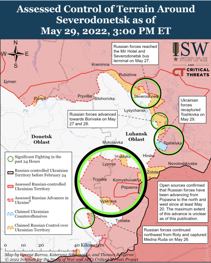 Очень важно, что российским нацистам так и не удалось полностью окружить украинскую группировку, которая обороняется в Северодонецко-Лисичанской агломерации. Все попытки оседлать трассу на Бахмут закончились провалом. Более того, позавчера Силы обороны отбросили россиян от нее сразу на два километра. Нам сообщают, что освобождены села Камышеваха и Врубовка (но бои там все еще ведутся). Это создает серьезную угрозу правому флангу попаснянской группировки противника, которая, к сожалению, продолжает наступать западнее, в районе Бахмута.