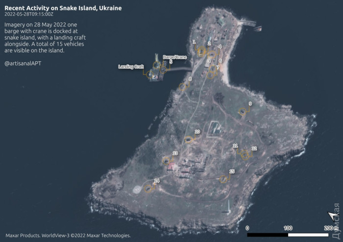 Российские нацисты продолжают осваивать захваченный остров Змеиный. Ранее они разместили на нем три зенитных ракетно-пушечных комплексов «Панцирь-С1», один ЗРК «Тор-М2» и комплекс радиоэлектронной борьбы. Вчера стало известно, что туда переправили еще и РСЗО – по всей видимости, «Торнадо-Г». В общей сложности на острове находится сейчас 15 машин, а возле него – несколько судов, в том числе десантных. Кроме того, похоже, скалу прикрывает какой-то большой ракетный корабль – возможно, фрегат проекта 11356Р. Защитники Украины пока выжидают и каких-то контрдействий против российской группировки не предпринимают.