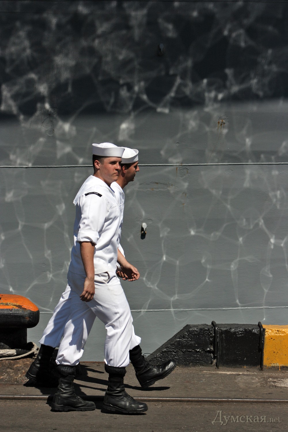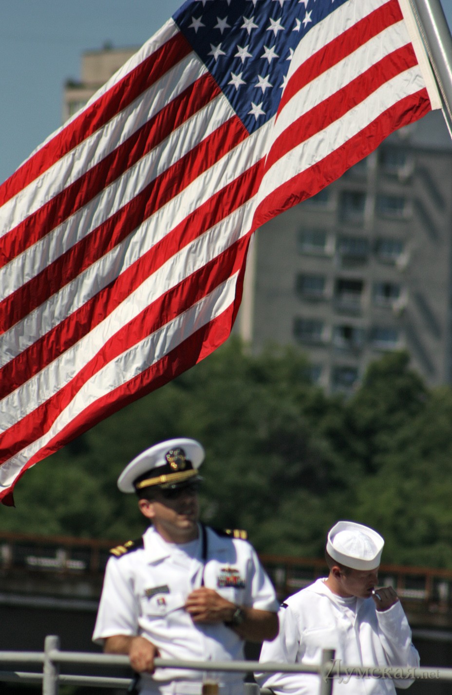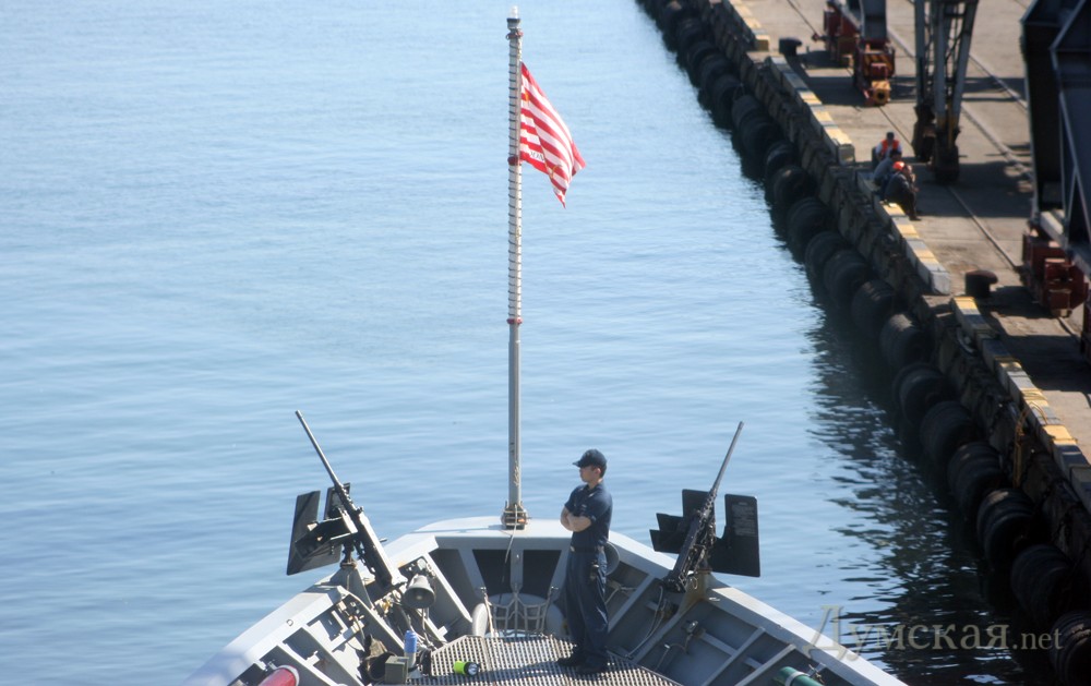 На центральной мачте большая жовто-блакитна ганчирка, а на корме и носу штатовские маленькие звездно-полосатые тряпочки. Мимикрируют под местность.