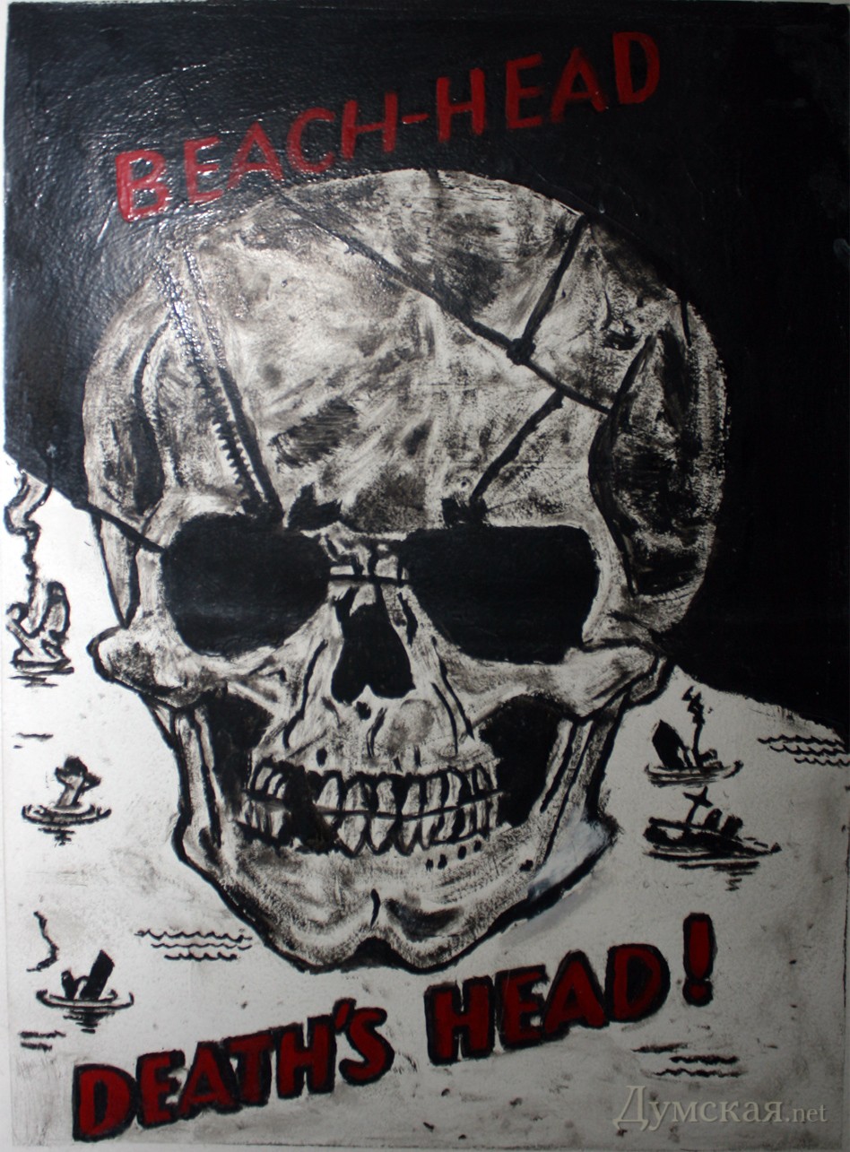 Дело в том, что плакатик Beach-Head / Death's Head! (это игра слов в английском языке, но весьма условно можно перевести так: «Береговой Плацдарм — Плацдарм смерти! ") практически без изменений воспроизводит немецкую (нацистскую) агитку времён второй мировой войны, а точнее 1944 года, посвящённую высадке (морскому десанту) союзников в Италии в январе — апреле этого же года.