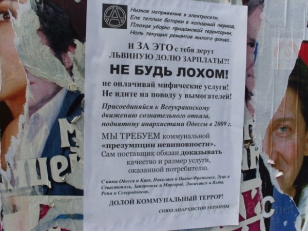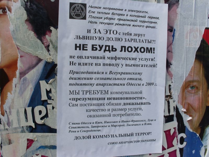 С 15 апреля Одесский союз анархистов проводит листовочную кампанию «Не будь лохом!» против поборов коммунальных служб за не предоставленные услуги. Кампания проводится в рамках Всеукраинского движения сознательного отказа, учрежденного ПП «Союз анархистов Украины» (САУ). Одновременно с одесситами на улицы вышли анархисты еще в одиннадцати городах нашей страны, — утверждает пресс-служба САУ.Листовка несет следующее обращение к украинцам: «Низкое напряжение в электросети. Еле теплые батареи в холодный период. Плохая уборка придомовой территории. Ноль текущих ремонтов жилого фонда… И за это с тебя дерут львиную долю зарплаты?! НЕ БУДЬ ЛОХОМ! Не оплачивай мифические услуги! Не иди на поводу у вымогателей! Присоединяйся к Всеукраинскому движению сознательного отказа (ДСО), поднятому анархистами Одессы в 2009 г. Мы требуем коммунальной «презумпции невиновности». Сам поставщик обязан доказывать, качество и размер услуги, оказанной потребителю. С нами Одесса и Киев, Николаев и Ивано-Франковск, Луцк и Севастополь, Запорожье и Миргород, Лисичанск и Ялта, Рени и Северодонецк. Долой коммунальный террор!».Цель движения, по словам представителей САУ, – пресечение произвола коммунальных монополистов с перспективой введения ЖКХ украинских городов под гражданский контроль жителей.