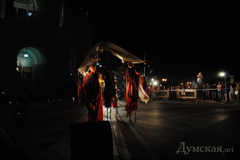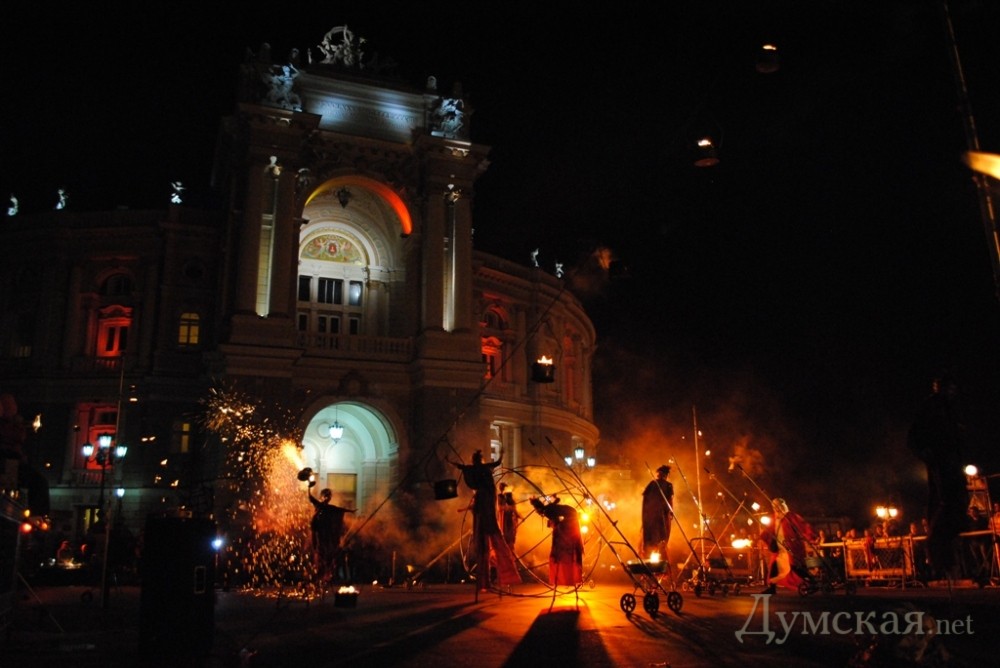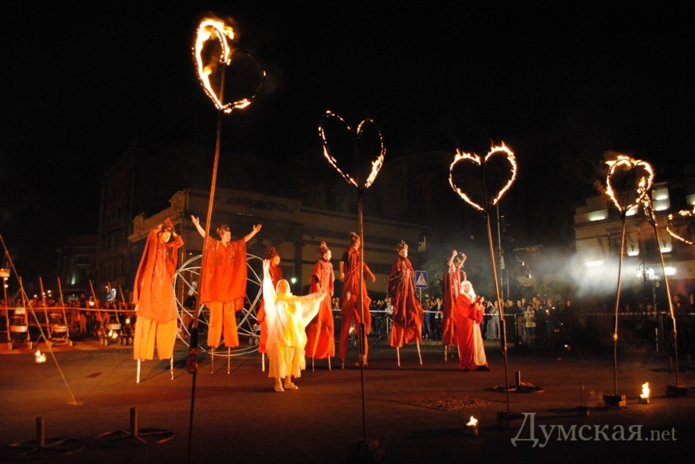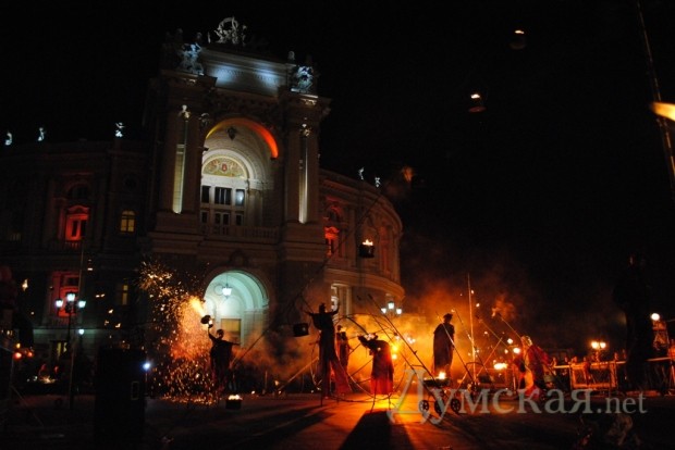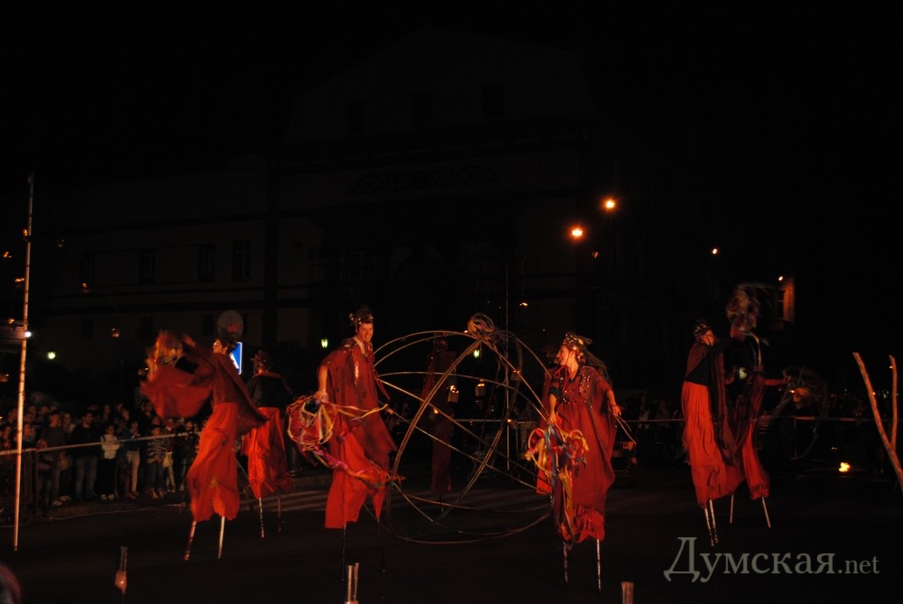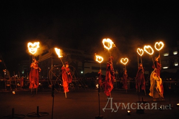 Однако самое интересное началось позже. В 20.00, одесскую публику в буквальном смысле «зажег» львовский академический духовный театр Ярослава Федоришина — «Воскресение». Актеры представили одесситам уличный спектакль «Глория». События, которые происходят в ходе постановки, символизируют историю развития человечества – от зарождения жизни до очищения и возрождения.