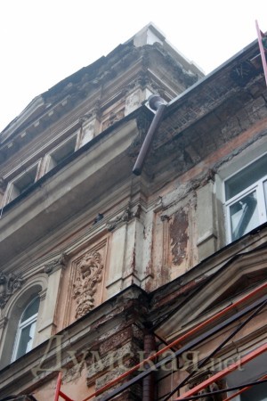 Как рассказала нашему журналисту жительница этого дома Светлана, в июле прошлого года в рамках городской программы по реставрации памятников архитектуры их дом обнесли лесами, демонтировали элементы лепки, а также большинство балконов. Реставрация была заморожена еще в начале октября 2010 года. Сейчас фасад дома полностью уничтожен предыдущими строительными бригадами, уникальная лепнина разбита, по периметру дома до основания сломаны все балконы верхних этажей. В данный момент присланные бригады рабочих спешно разбирают леса, оставляя памятник архитектуры на произвол судьбы полностью открытым для непогоды и не защищенным от дальнейшего обрушения.