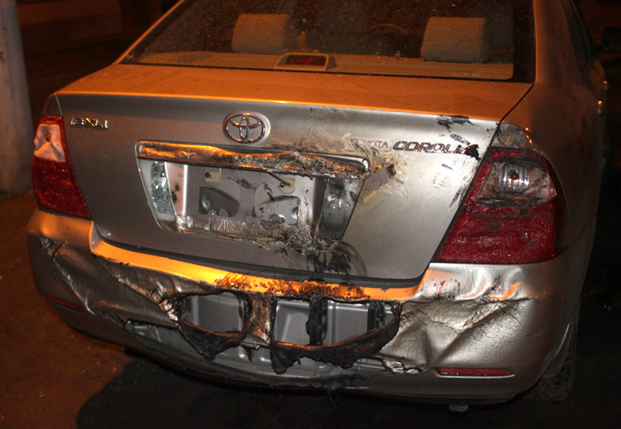 Наш корреспондент побывал на месте взрыва автомобиля, который произошёл около 19:20 на улице Транспортной. По словам очевидцев взровалось Dacia Logan. Водитель почуствовал задымление, вышел из машины и вызвал пожарных. Через 10 минут машина взровалась. Жертв нет. Выбиты стекла в ближайших домах. Немного пострадали стоящие рядом автомобили. Видео пользователя YouTube с ником Esfero92.