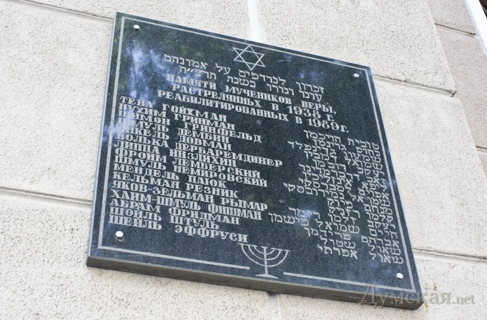 Доска с фамилиями расстреляныхх..меня всегда удивляла подобная доска на городском управлении МВД на Преображенской..растреляны Деникинцами по процессу 19 и только одна нееврейская фамилия..Он то среди них что делал???