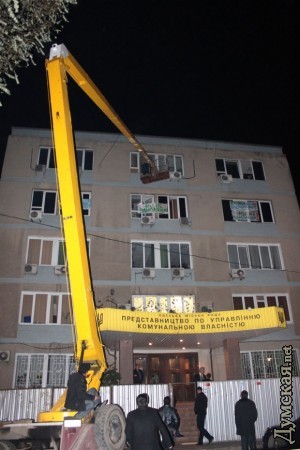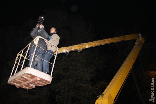 Как сообщает наш корреспондент, к муниципальному зданию по ул. Артиллерийской, 1 только что подогнали автомобильную вышку. Журналисты воспользовались моментом, и взобравшись в кабину, стали снимать из неё свою обесточеную студию.