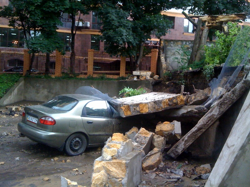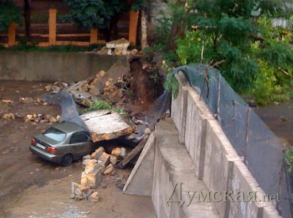 Во время ливня обвалилось дерево, а от потоков воды обвалилась часть каменного забора на улице Генуэзской. Пострадал припаркованный под забором автомобиль. Пострадавших нет.