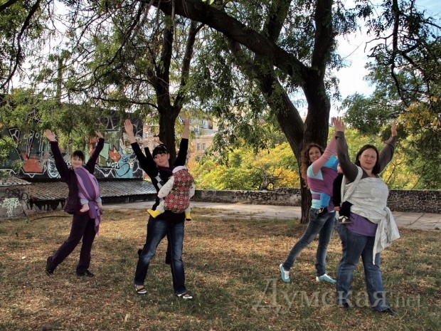 С ребенком за плечами. Одесские слингомамы играли в футбол и занимались гимнастикой