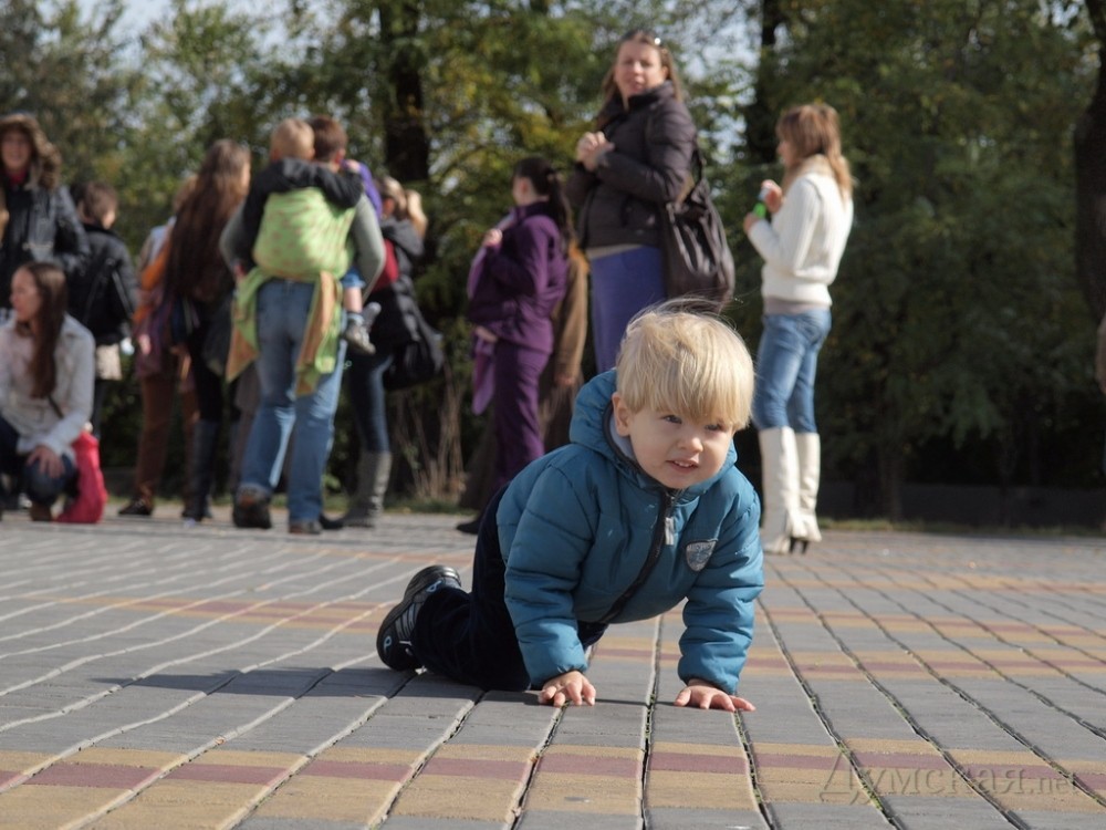 Одесские мамочки собрались у колоннады на Приморском бульваре. Здесь, под пристальным вниманием фотокамер одесситки вместе со своими чадами писали картины, занимались гимнастикой и даже играли в футбол и бадминтон.