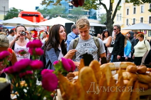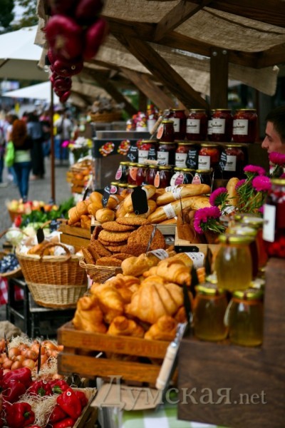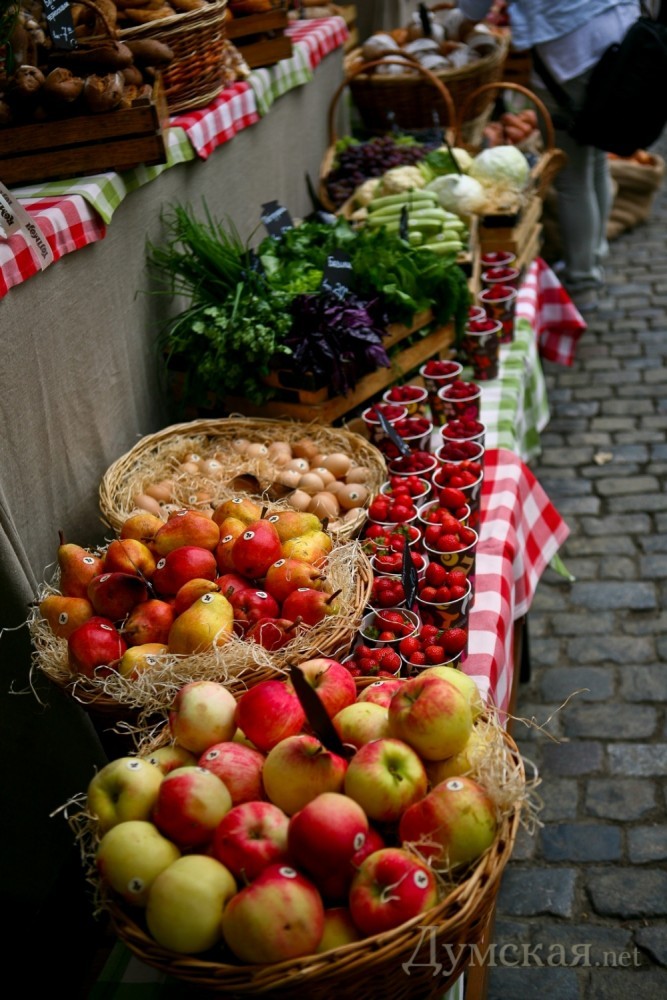 На улице Дерибасовской в Одессе открылась Ярмарка местных продуктов и вкусной еды. На ярмарке представлены cыры, мясо, масло, копчености, варенья, соленья, домашние яйца, лапша, овощи и фрукты из Одесской области. Сыры привезены из Франции и Италии.