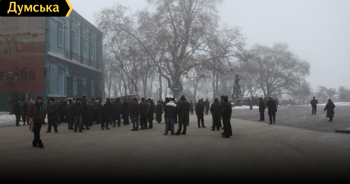 Фотокорреспондент Думской.net прибыл по редакционному заданию на Думскую площадь. Напомним, ровно год назад нам удалось снять массу гостей, спешащих с подарками Эдуарду Гурвицу. В этот раз в мэрии тщательнее подготовились к работе нашего фотокорра. На самой Думской площали дежурят все боевики Эдуарда Гурвица и Вахтанги Убирии в полном составе. В частности замечены Марк Соколов, Олесь Янчук, Владислав Казаков, Бесики Мархулия (участник нападения на Алексея Гончаренко у Дюка 5 апреля 2009 года). Также возле памятника Пушкину проходит пикет вкладчиков КСУ. Ведёт пикет Валерий Кауров. Когда наш корреспондент снимал пикетчиков, к нему подошли лидер «Свободной Одессы» Марк Соколов и начальник управления развития потребительского рынка и торговли Олесь Янчук. Схватили за руки и со словами «Мы тебе сейчас в мэрии как попозируем!» потащили в мэрию. Что ждало корреспондента в мэрии — не известно, так как он смог вырваться и убежать от них. Также были совершены нападения на репортера издания «Таймер» Александра Вельможко и съемочную группу телеканала АТВ. Напомним, что Олесь Янчук по-прежнему числится подозреваемым в организации заказного убийства. Марк Соколов проходит в Киеве по делу о нанесении тяжких телесных повреждений. Так же одна из пожилых участниц пикета по КСУ заявила корреспонденту, что Эдуард Гурвиц им очень помог. На вопрос — «А деньги вам вернули?» она ответила — «Не вернули, но он нам помог». Блажен, кто верует. СМЕРТЬ РОСІЙСЬКИМ ОКУПАНТАМ! Помітили помилку? Виділяйте слова з помилкою та натискайте control-enter