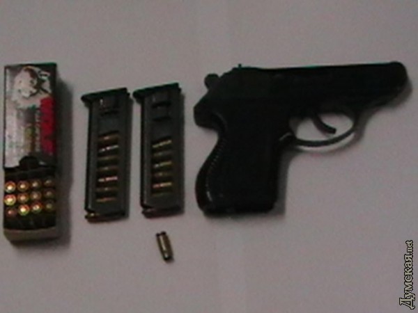 Во время проведения внешнего транспортного средства со служебной собакой в пепельнице, которая находится в передней панели автомобиля, была обнаружена стреляная гильза калибра 5,45 мм. Далее были найдены в сумке из-под ноутбука  огнестрельный пистолет марки «ИЖ — 75(Байкал)», в подлокотнике между передними сидениями автомобиля — два снаряженных магазина к пистолету марки «ИЖ — 75(Байкал)»: один — с восемью зарядами калибра 5,45 мм, второй — 7 зарядов калибра 5,45  мм, а также в личных вещах упаковку с зарядами калибра 5,45 мм в количестве 12 штук.