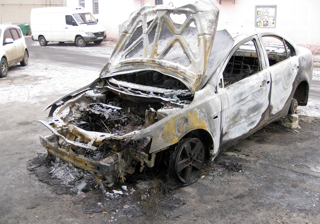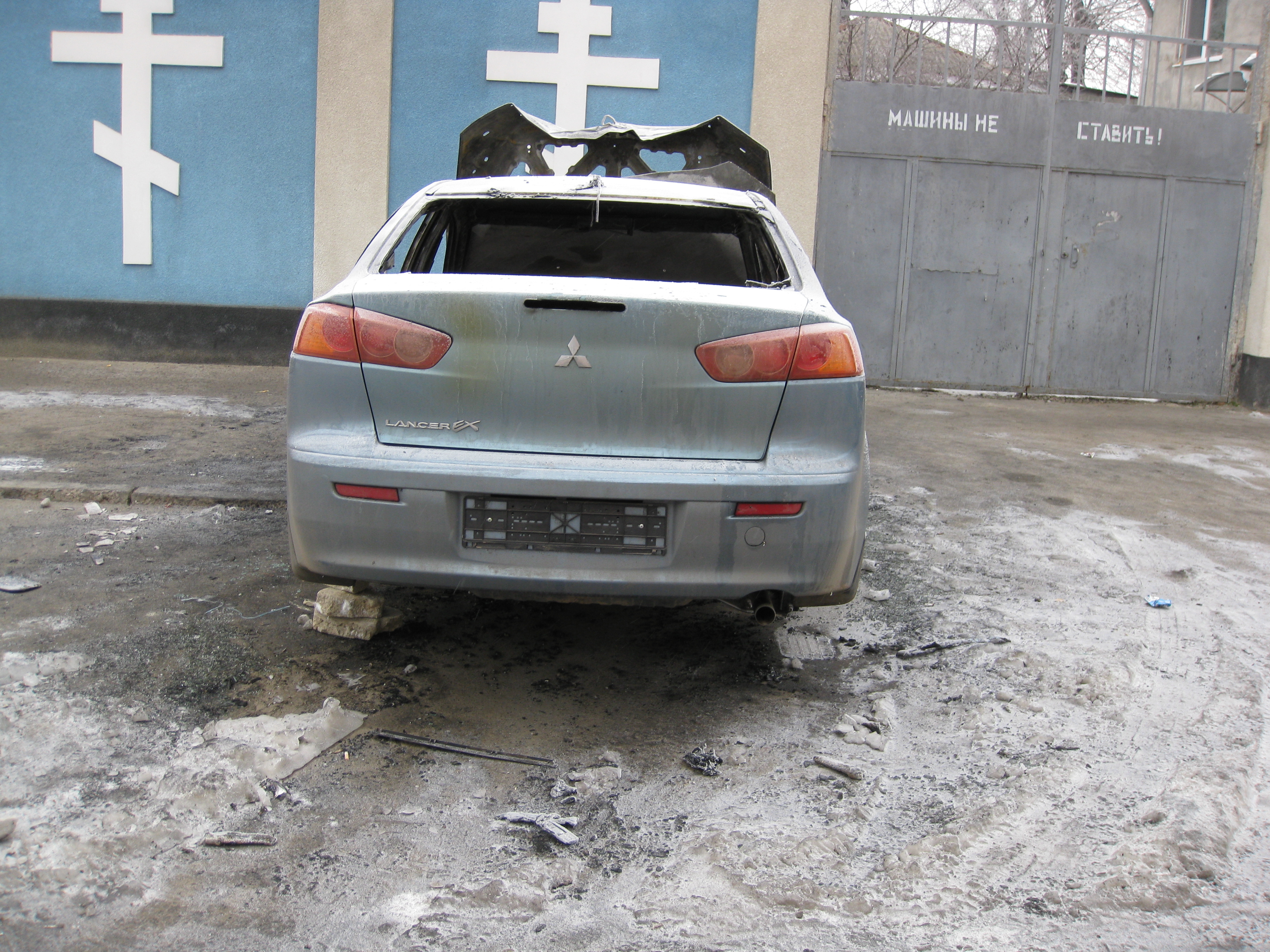 Видел этот автомобиль утром, а пожар видимо произошел ночью. Горел по всйе видимости капот машины. А потом бомжи разобрали всё. и колеса передние сгоревшие до тла, номера видать хозяева сняли к обеду.Вчера утром еще с номерами был. И не какой это не поповский автомобиль. Попы этой церкви ездят на Мерсах и джипах и микроавтобусах. А Mitsubishi Lanser X это не их уровень.
