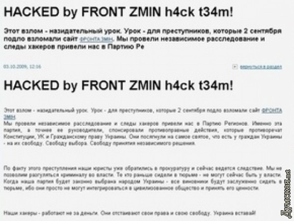 Официальный сайт Партии регионов сегодня утром подвергся хакерской атаке, сообщает «Корреспондент.net». На главной странице сайта можно было увидеть такое сообщение: ![]() «Этот взлом — назидательный урок. Урок — для преступников, которые 2 сентября подло взломали сайт ФРОНТА ЗМІН», — говорится в сообщении. Далее текст сообщения выглядит следующим образом: Мы провели независимое расследование и следы хакеров привели нас в Партию Регионов. Именно эта партия, а точнее ее руководители, спонсировали противоправные действия, которые противоречат Конституции, УК и Гражданскому праву Украины. Они посягнули на самое святое, что есть у граждан Украины — на их свободу. Свободу выбора. Свободу принятия независимого решения. По факту этого преступления наши юристы уже обратились в прокуратуру и сейчас ведется следствие. Мы не позволим разгуляться криминалу во власти. Те кто раньше сидели в тюрьме — не могут сейчас быть у власти. Когда наша партия будет законно выбрана народом Украины — все виновники будут заслуженно сидеть в тюрьме, ибо они просто не могут интегрироваться в цивилизованное общество и принять его ценности. Наши хакеры — работают не за деньги. Они отстаивают свои права и свою свободу. Украина вставай! Ваш А.Я. P.S. Юлечка, я тебя всегда любил, я знаю — ты все сможешь. Держись. Спустя некоторое время данное сообщение было удалено. Как сообщалось, 2 сентября сайт общественной организации «Фронт перемен», лидером которой является Арсений Яценюк, подвергся атаке хакеров. СМЕРТЬ РОСІЙСЬКИМ ОКУПАНТАМ! Помітили помилку? Виділяйте слова з помилкою та натискайте control-enter