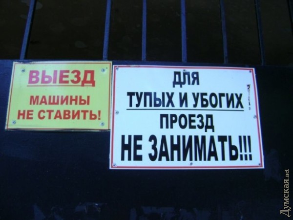 Kатегорически не согласен (с Максимом)! Такие факты необходимо снимать и публиковать. Это объявление — наглядное демонстрация хамства и грубости некоторых наших людей, какой-то пещерной дикости. Причем с обеих сторон. «Объявленцев» и тех, с кем они борются — нецивилизованных парковщиков. На Западе, кстати, подобные предупредительные таблички — естесственно без «тупых и убогих»! — виднеются возле любого дома.