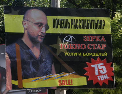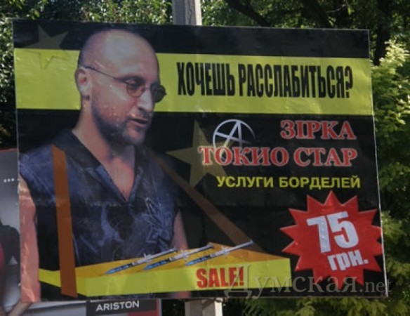 Сегодня на перекрестке улиц Водопроводной и Старосенной площади в районе Одесского железнодорожного вокзала появился билборд с изображением очередного врага мэрии. На рекламном щите — фотография бизнесмена Вадима Черного, владельца отелей «Зирка» и «Токио-стар», имеющих неоднозначную репутацию. Напомним, что в прошлом месяце бизнесмен обвинил в поджоге своего джипа «Хаммер» давнего недруга — мэра Одессы Эдуарда Гурвица. Вадим Черный назвал поджог местью за то, что возглавляемая им организация — Союз анархистов Украины — последовательно боролась против одесского городского головы. Кроме фотографии, на билборде есть надпись: «Хочешь расслабиться? «Зірка»,«Токио-стар»: Услуги борделей за 75 грн.» и знак анархистов. Напомним, что билборды с изображением критиков Эдуарда Гурвица появляются в нашем городе регулярно, с января прошлого года. На них в разное время были изображены: депутат Одесского городского совета Алексей Гончаренко, директор телеканала «Град» Анатолий Балинов, экс-начальница КРУ Лилия Томашевская, президент Федерации футбола Украины Григорий Суркис, депутат и телеведущая Светлана Фабрикант, лидер партии «Родина» Игорь Марков а также одесский бизнесмен Андрей Азаров. СМЕРТЬ РОССИЙСКИМ ОККУПАНТАМ! Заметили ошибку? Выделяйте слова с ошибкой и нажимайте control-enter