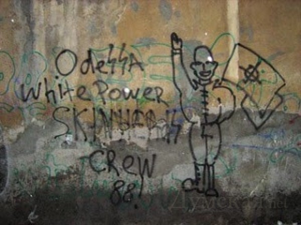 Так, к старым врагам неонацистов в лице одних из коренных жителей Одессы — евреев или «жидов», как их оскорбительно называют антисемиты, добавились новые объекты неприязни – выходцы из стран и республик Кавказа, Средней Азии, а также арабских стран и Африки, которых «определяют» по стереотипным антропологическим признакам. Антисемитские настроения и лозунги, нередко основанные на популярном мифе о «всемирном заговоре евреев», дополнились «практической» ксенофобией, происходящей от экономической и социальной депривации. Неологизмы, обозначающие выходцев из разных стран и частей света, нашли своё отражение в «протестных», оскорбительных и даже угрожающих надписях на заборах и городских стенах, а также других публичных местах. Ксенофобные граффити часто имеют авторство, и не являются абсолютно анонимными. Подобное авторство зачастую коллективно, и на него указывают специальные символы, знаки (свастика и её стилизации, кельтский крест, солнцеворот, тризуб, руна отала и др.) или подписи (ns, wp, 14/88, reactor.org.ua, чайка, сiч, сна, славянское единство, упа, анти-антифа и др.). Отчасти это объясняется тем, что рисование граффити является частью планомерной политики вышеперечисленных движений и организаций. Мы призываем одесситов проявить свою гражданскую позицию и закрашивать подобные расистские надписи вблизи своих домов. Хватит терпеть подобные выходки и ждать чей-то помощи — пора действовать самостоятельно«. »Думская.net», в свою очередь, напоминает, что 7 июля прошлого года наши драгоценные городские депутаты приняли (кстати — практически единогласно) законопроект о противодействии «фашизму, нацизму и ультрарадикализму». Автор проекта, депутат горсовета от Народной партии Алексей Косьмин особо подчеркивал, что проект предусматривает борьбу с любыми проявлениями экстремизма и нетерпимости независимо от религии, идеологии или национальности. В общем, дворников и коммунальщиков обязали стирать со стен домов и заборов фашистские и ксенофобские надписи. Но каждый жительнашего города может убедиться в том, что воз и ныне там