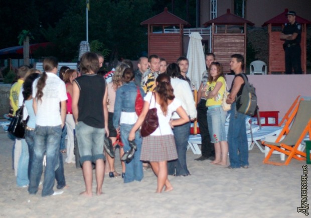 Перепалка с работниками пляжа закончилась тем, что были вызваны сотрудники милиции, которые не прояснили ситуацию, но девушки смогли остаться на территории пляжа. Организаторы акции также утверждают, что днем на этом пляже сидит контролер и требует за вход на огороженную территорию с отдыхающих по 30-45 гривень. При этом, согласно решению городского совета, уже несколько лет вход на все пляжи города являются свободным. Чтобы проучить арендаторов пляжа, одесситы демонстративно пришли на «Отраду» вечером с тем, чтобы отстоять свое право на свободный доступ к морскому побережью. Сотрудники пляжа узнали о готовящейся акции из Интернета и начали скандалить с пришедшими. Один из работников пляжа столкнул Алену Егорову с топчана, на котором она сидела и, когда приподнял его, заявил, что та сломала топчан. Арендатор пляжа Резникова Е.Ю. заявила, что Егорова должна заплатить за поломанное имущество и вызвала милицию. Приехавшая опергруппа повезла Егорову в отделение, но по дороге им позвонили из администрации пляжа и попросили вернуть девушку на пляж, чтобы разобраться в ситуации. Когда же машина вернулась на пляж, Резникова Е.Ю. уже ушла. Все это время из громкоговорителя, находящегося на канатной дороге раздается голос, который хамил пришедшим в этот вечер в «Отраду» одесситам. Также из динамика прозвучали слова, что пришедший для выяснения обстоятельств начальник городского управления молодежной и семейной политики Андрей Юсов является «главным клоуном».