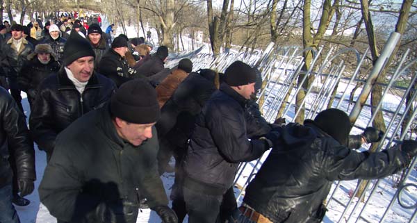 Сразу же начинается "штурм" забора. Охрана безуспешно пытается сдержать натиск собравшихся жильцов
