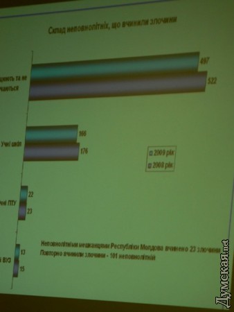 Как сообщает наш корреспондент, сегодня подразделения криминальной милиции по делам детей ГУ МВД Украины в Одесской области в ходе отчета о проделанной работе за 2009 год рассказали журналистам о так называемой «группе риска» — детях, которые нигде не учатся. По словам полковника милиции Татьяны Семикоп, в начале 2009 года быстрыми темпами увеличилось количество преступлений, совершенных не работающими и не учащимися несовершеннолетними. После этого был подписан договор о совместной деятельности ГУ МВД Украины в Одесской области с центрами трудоустройства и в результате этой программы было трудоустроено около 100 несовершеннолетних. Стоит отметить, что многие дети отказывались от предложений трудоустройства — маленькая зарплата, к тому же многим слишком далеко приходилось ездить на работу, в результате чего заработок оказывался бессмысленным — все уходило на проезд. «По многим причинам отказывались сами родители, ведь дети для них - работники подсобного хозяйства в частном доме», — объяснила ситуацию Татьяна Семикоп. СМЕРТЬ РОСІЙСЬКИМ ОКУПАНТАМ! Помітили помилку? Виділяйте слова з помилкою та натискайте control-enter |