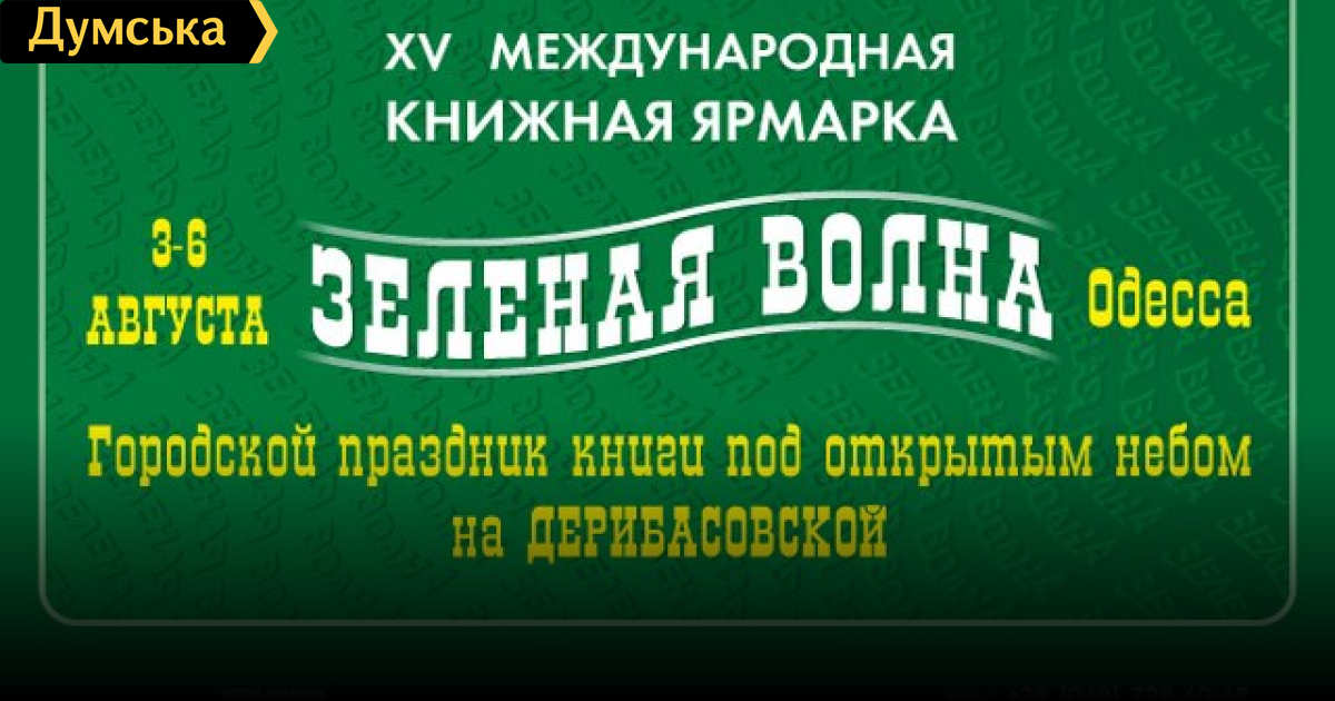 В начале августа на ул. Дерибасовской, под открытым небом, будет проведена ХV Международная книжная ярмарка «Зеленая волна», сообщает муниципальное управление информации. «С целью привлечения внимания к нашему городу как центру развитой духовной культуры», согласно распоряжению Одесского городского головы №1217-01р от 22.07.2011 г. утвержден состав рабочей группы по проведению книжной ярмарки, которую возглавила вице-мэр Елена Павлова. Организационную и информационную помощь в проведении ХV Международной книжной ярмарки «Зеленая волна» будут предоставлять управление культуры и туризма, управление образования и науки Одесского, департамент информации и связей с общественностью Одесского городского совета. Ярмарка пройдет с 3 по 6 августа 2011 года. СМЕРТЬ РОСІЙСЬКИМ ОКУПАНТАМ! Помітили помилку? Виділяйте слова з помилкою та натискайте control-enter