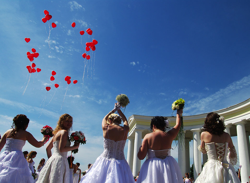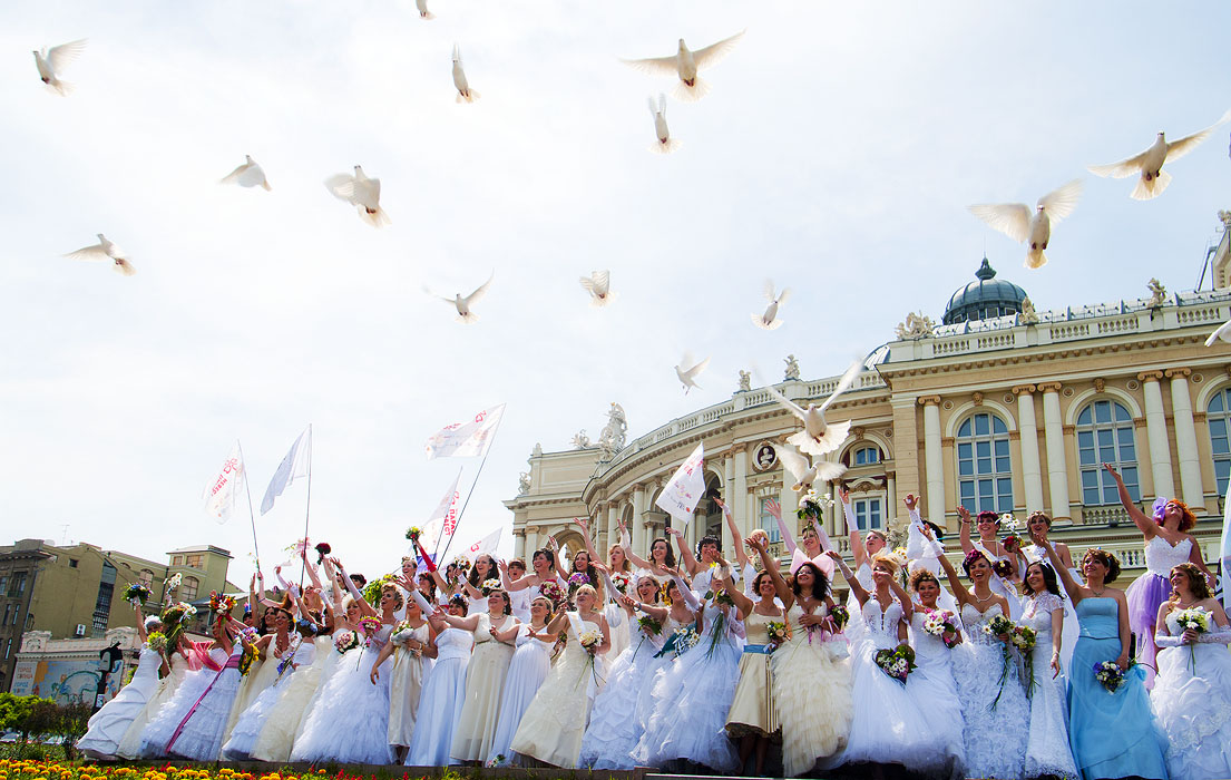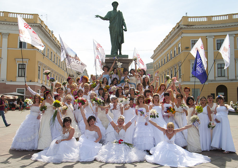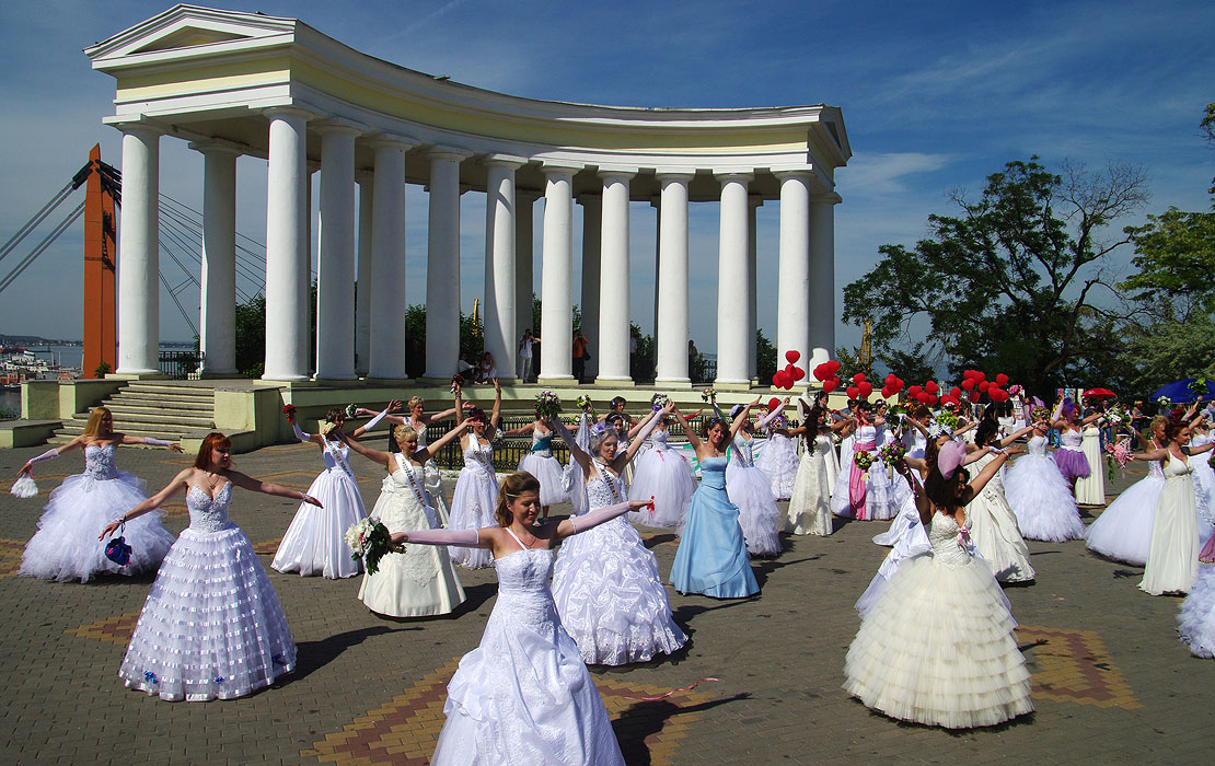 Возле одного из торговых центров на Дерибасовской колонна невест как бы случайно выстраивается в причудливую фигурку.