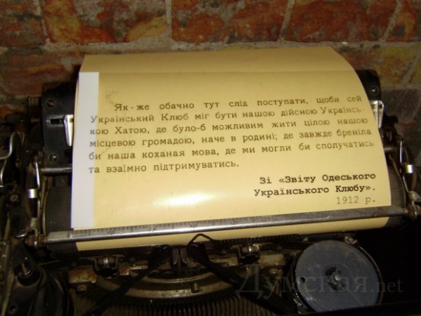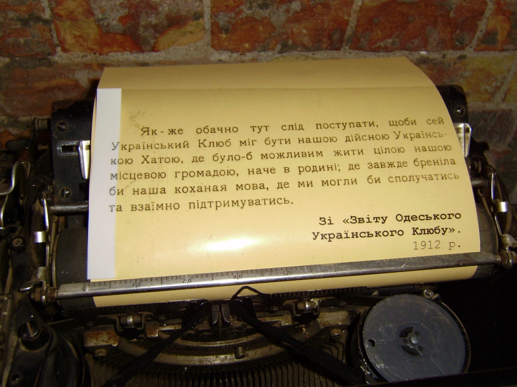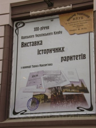 Остались украинцы в Одессе и через 110 лет после основания города. Оказывается, первая организация «Просвіта» была основана именно в нашем городе в 1905 году. На смену ей (после первого запрета) в 1910 г. пришел «Украинский клуб» (по орфографии того времени – «Клюб»). Именно 100-летие этого клуба отмечают одесские украинцы в этом году. В честь этой даты в музее современного искусства по ул.Пушкинской, 32 открыта выставка исторических раритетов, которая продолжит свою работу до 8 июня. Автор выставки, заслуженный работник культуры Украины, коллекционер Тарас Максимюк сообщил, что начал собирать свою раритетную коллекцию с 1964 года, в то время когда учился в Одесском институте инженеров морского флота. По словам коллекционера, наибольшую ценность представляют материалы, которые касаются одесской Украины, то есть – украинцев в Одессе.