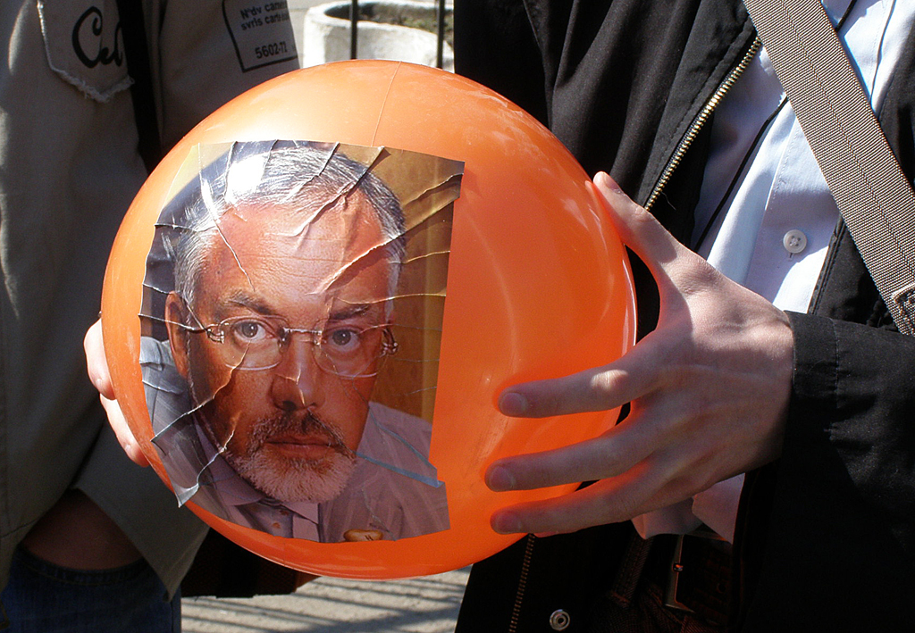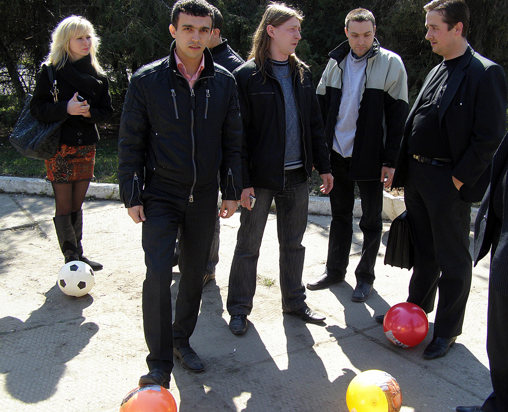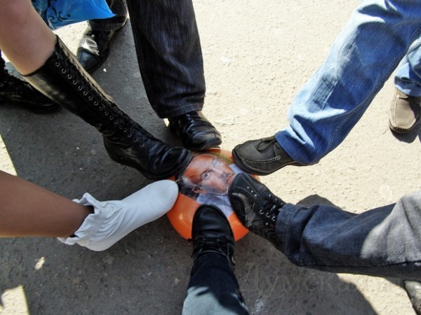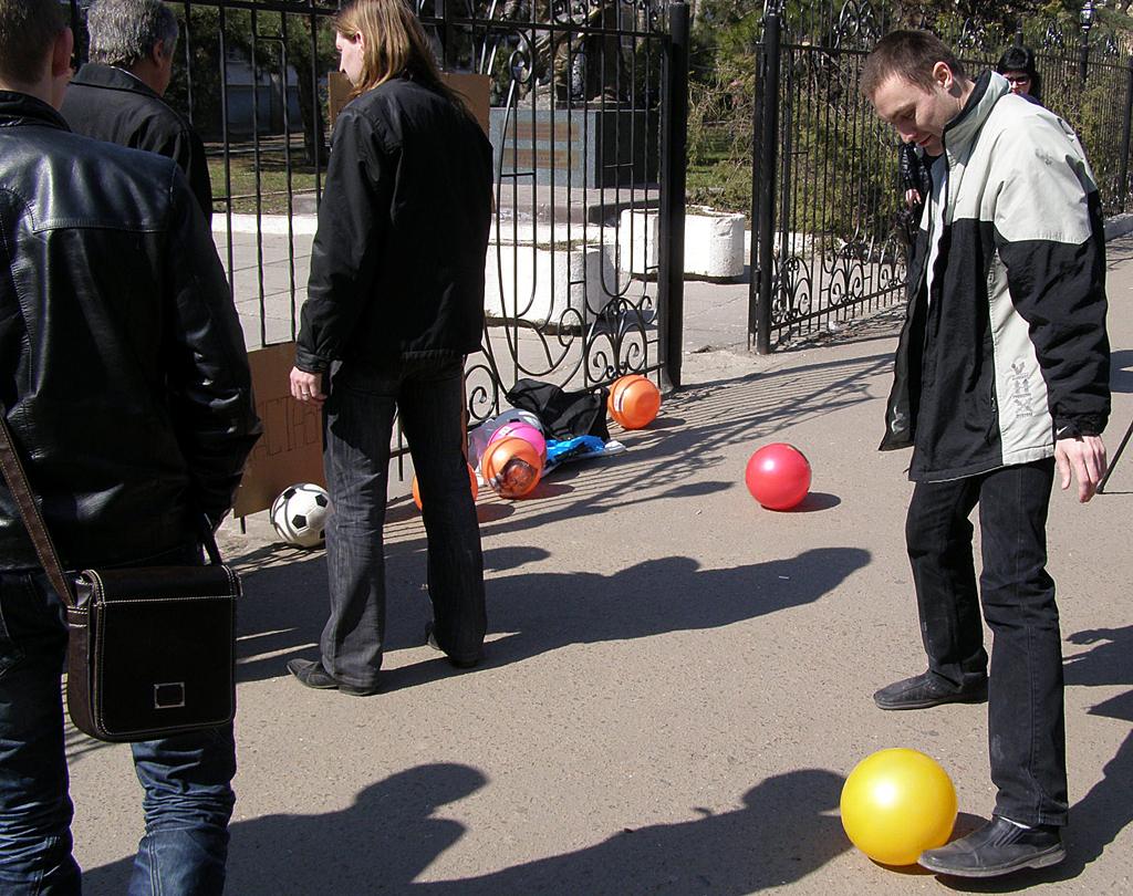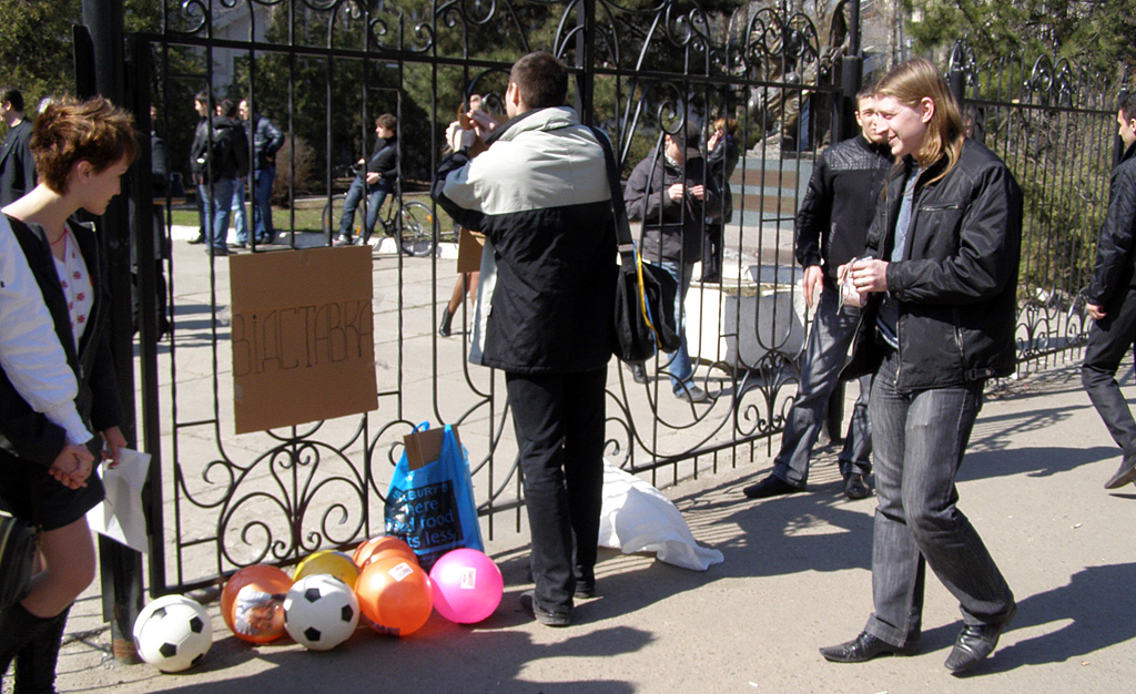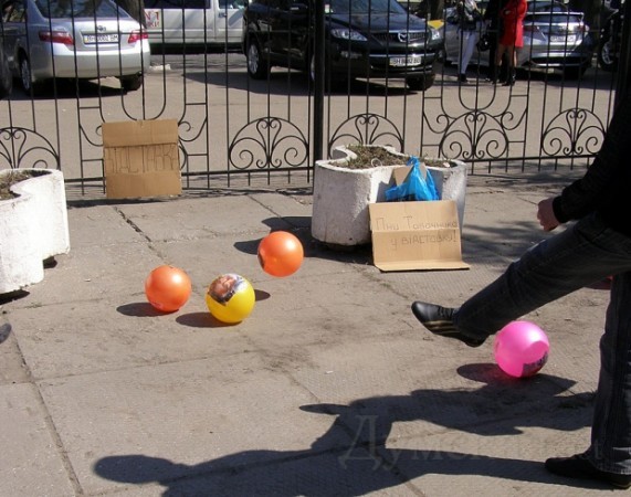 Сегодня днём группа странных молодых людей решила отправить нового министра образования Украины Дмитрия Табачника в отставку. Причем сделано это было довольно оргигинально. Студентам, проходившим мимо, предлагалось забить надувные шарики с изображением Табачника в импровизированные ворота, озаглавленные надписью на куске картона «Отставка».