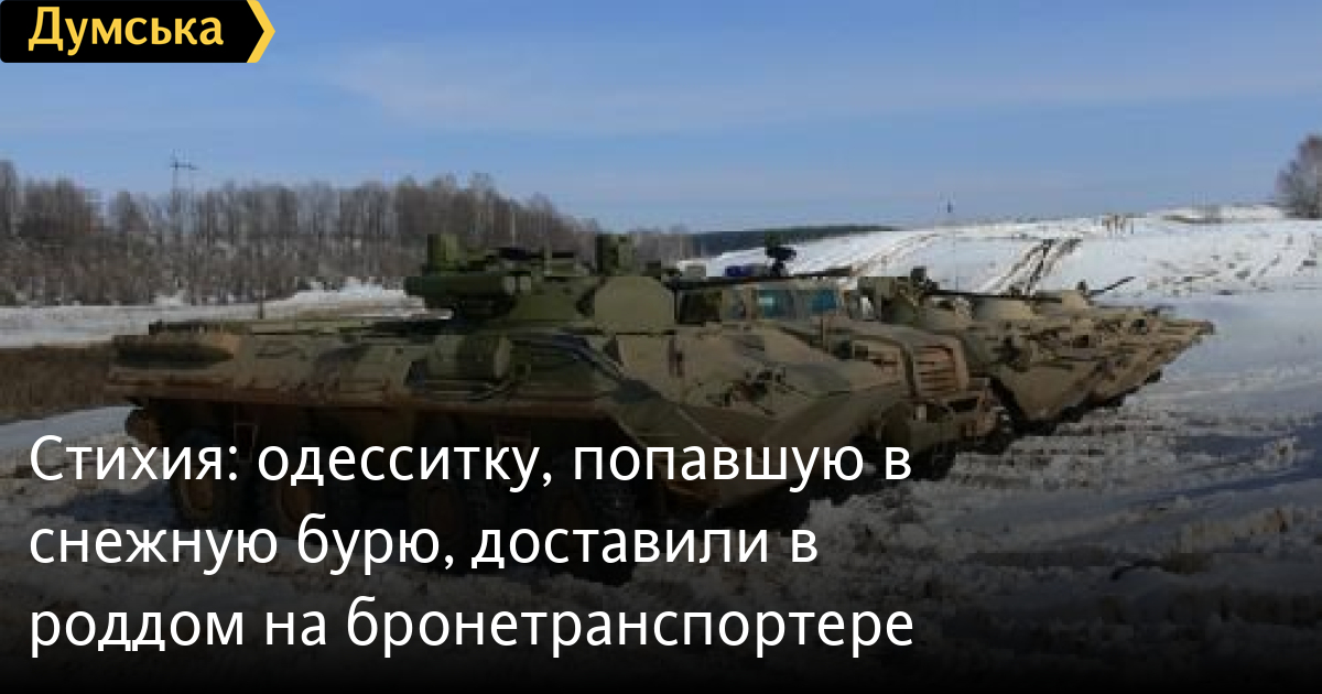 Стихия: одесситку, попавшую в снежную бурю, доставили в роддом на бронетранспортереКак известно, из-за разыгравшейся стихии машины Скорой помощи не могут справиться со своей работой. Поэтому на помощь одесситам приходит местная служба МЧС. Как сообщил сегодня центр по связям с общественностью Министерства чрезвычайных ситуаций Украины, вчера, 19 декабря, беременную одесситку пришлось доставлять в родильный дом на бронетранспортере БТР-80. Роженица была благополучно доставлена в медицинское учреждение. Всего же за время стихии МЧСниками спасены 4 851 автомобиля, включая грузовые, и 9 090 людей. На пунктах обогрева МЧС предоставлена помощь 1 111 людям. Расчищены от снеговых заносов 2260 километров автодорог, за последние сутки — 604 км. СМЕРТЬ РОССИЙСКИМ ОККУПАНТАМ! Заметили ошибку? Выделяйте слова с ошибкой и нажимайте control-enter |