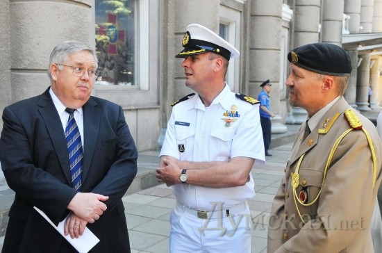У Дома офицеров на ул.Пироговской Как сообщалось, в учении планируют принять участие представители 17 стран. От ВМС ВС Украины к учению планируется привлечь до 20 кораблей, катеров и судов, усиленный батальон морской пехоты со штатным вооружением и техникой, другие подразделения, а также самолеты и вертолеты морской авиации. Всего же к учению планируется привлечь до 1,2 тыс военнослужащих (без учета численности экипажей кораблей и самолетов), а также до 90 единиц автобронетанковой техники. Учения пройдут на территории Одесской и Николаевской областей, и в северо-западной части Черного моря.